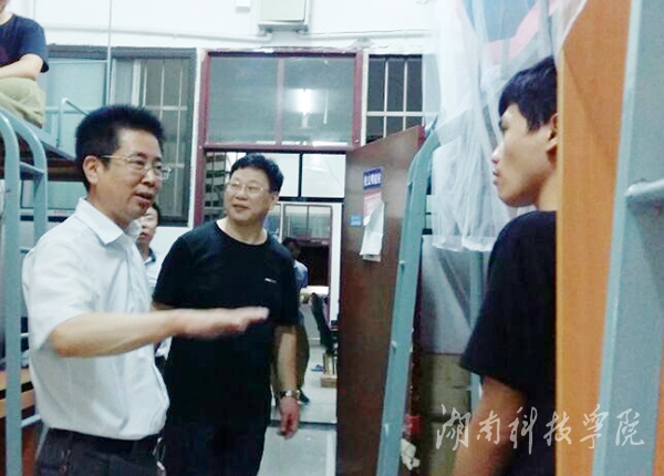本网讯(通讯员 罗晶)寝室卫生怎么样?寝室的学习氛围怎么样?这些问题让校长曾宝成时刻牵挂着。为了解各个学院“抓学风”和“抓寝室卫生”情况,6月7日22:20,曾宝成在学工部部长唐华山、党政办主任胡清华的陪同下冒着大雨走访了桃园、松园男生公寓,并与部分学生进行亲切交谈。在桃园第七学生公寓B座传媒学院某男生宿舍,曾宝成深情地对同学们说:“学校为什么要花大力气来抓学风,抓卫生?就是为了更好地让同学们成长成才,练好内功,服务社会,报效国家,报答父母。”“抓卫生是为了营造更好的住宿环境,更有利于同学们健康成长,寝室卫生要抓出成效,要常抓不懈;抓学风是为了建设良好校风,我们要把学风作为一项重要事情来抓,家长把小孩交给学校,学校有责任有义务把学生管好,教好。老师平时如果不去管理,不去抓学习,不去抓学生健康成长,学生考试挂科拿不到毕业证,对于学校来说损失是1%,但对于一个家庭的损失来说是100%,我们没有尽心教育好就是失职”。