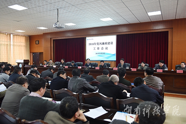 会议下发了2016年党风廉政建设和反腐败工作要点、宣传思想工作要点和综治维稳工作报告。党委副书记唐艳明宣读了《关于表彰2015年度综治维稳工作先进单位的决定》以及2015年荣获省级以上奖励的集体和个人名单。学校领导为获奖单位颁奖。全校各直属党组织负责人和各单位负责人签订并递交了《党风廉政建设目标管理责任书》、《综治维稳工作责任状》和《保密承诺书》。