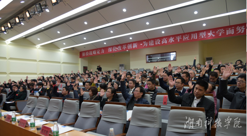 报告提出了今后五年学校发展的总体目标和指导思想,提出要以建成高水平应用型大学,实现学校影响力、学生竞争力、师生幸福力同步提升为总体目标。在具体实施时,分三步走:第一步,“十三五”时期,努力迈进湖南省转型发展高校先进行列;第二步,再用五至十年,把学校全面建成有区域影响力的先进技术转移中心、科技服务中心、技术创新基地和应用型人才培养中心;第三步,到建校一百周年把学校建成有地位、有影响的高水平应用型大学。围绕三步走目标,在“十三五”时期要努力实现“两个重点突破”、 “三个显著提高”和“四个全面改善”, “两个重点突破”即高层次人才队伍建设、高水平特色创新团队建设实现突破;成为“服务国家特殊需求人才培养项目”工程硕士专业学位试点院校,实现办学层次突破。实现“三个显著提高”,即应用型人才培养质量显著提高、学科专业水平显著提高、协同创新与社会服务能力显著提高。“四个全面改善”,即办学条件全面改善、治理体系全面改善、校园环境全面改善、职工生活全面改善。