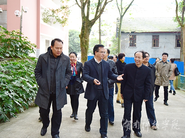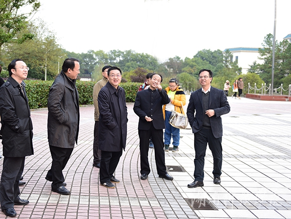 陈弘对秦裕辉一行的到来表示热烈欢迎,兴致勃勃地陪同参观了校园。陈弘结合我校办学概况、发展历史边走边介绍。在文化广场上,陈弘介绍了我校的地理位置,并就弘毅楼、博雅楼、明德楼等在校训中的蕴意进行生动解说,他引用中医中“阴阳调和”的理念介绍学校的布局。秦裕辉一行还参观了我校布克校园书店、图书馆,详细考察了“柳宗元研究所”与“舜文化研究基地”等学术科研基地。