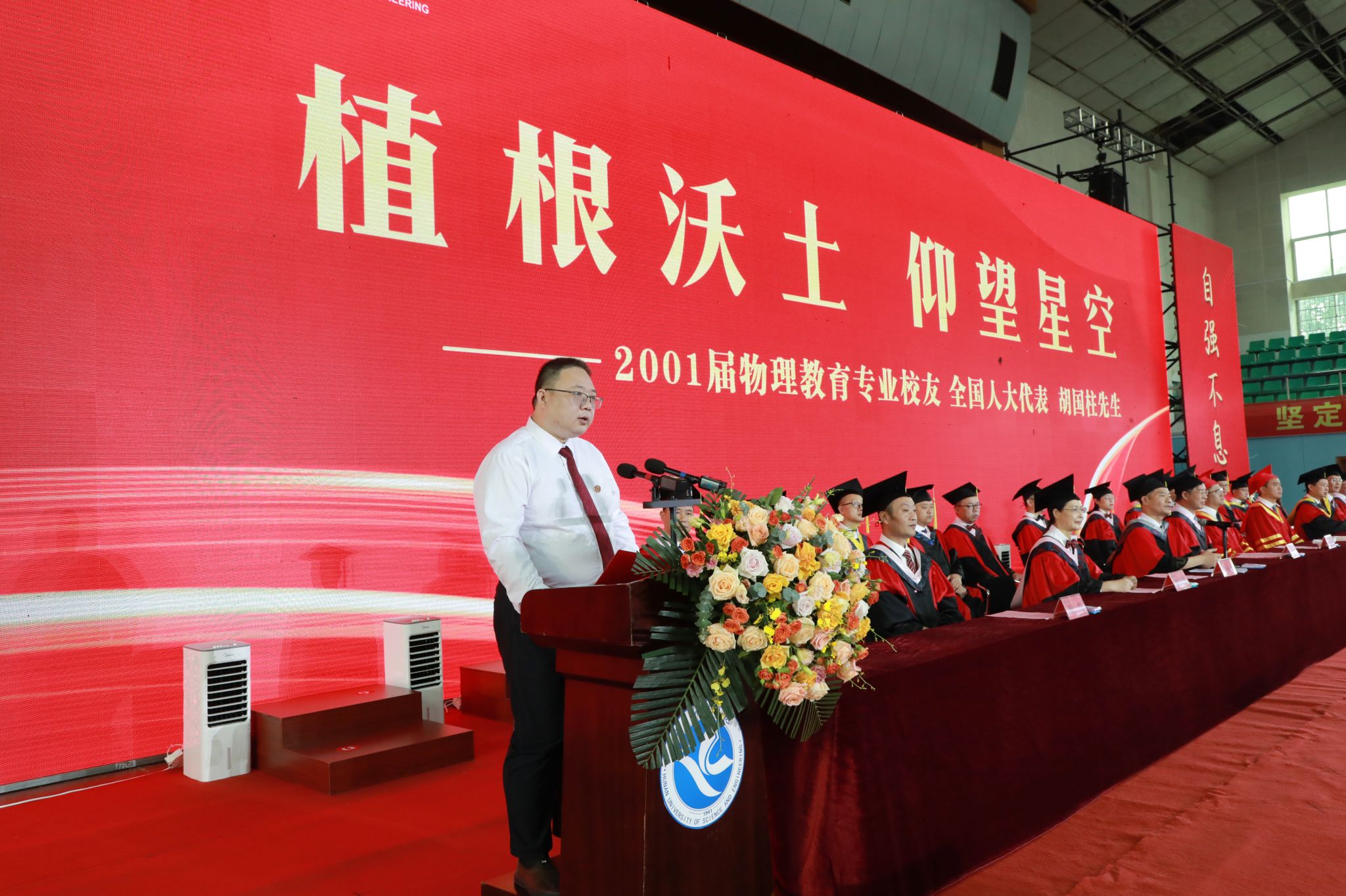 “未来的路还很长,但只要我们保持谦逊、务实的心态,不断学习和成长,就一定能够在各自的岗位上发光发热。”第十四届全国人大代表、我校物理系9801班毕业生胡国柱作为优秀校友代表,对全体毕业生表示热烈的祝贺和殷切的祝福。