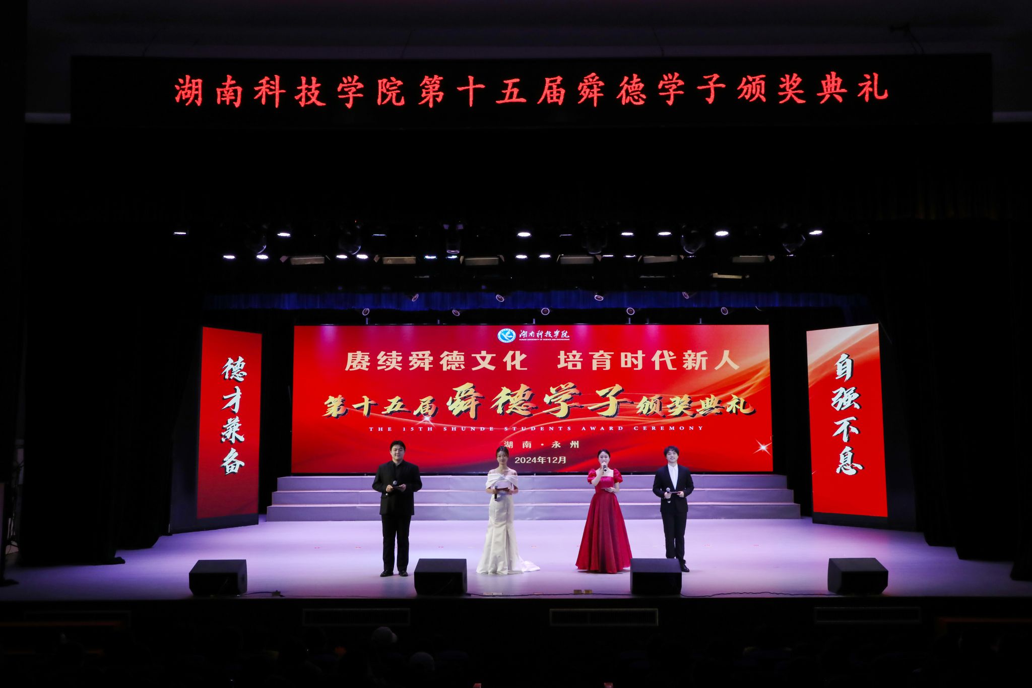本网讯(记者 唐晶 刘斌 彭尧煜)赓续舜德文化,培育时代新人。12月10日,学校举行第十五届“舜德学子”颁奖典礼,104名优秀学子获表彰。校党委书记李钢,党委副书记、校长黄创霞,校领导宋宏福、李常健、吴小林、陈灿军,党委委员、组织部部长杨涛,校友企业代表、安骏物流公益基金会管理部经理陈泽出席典礼。