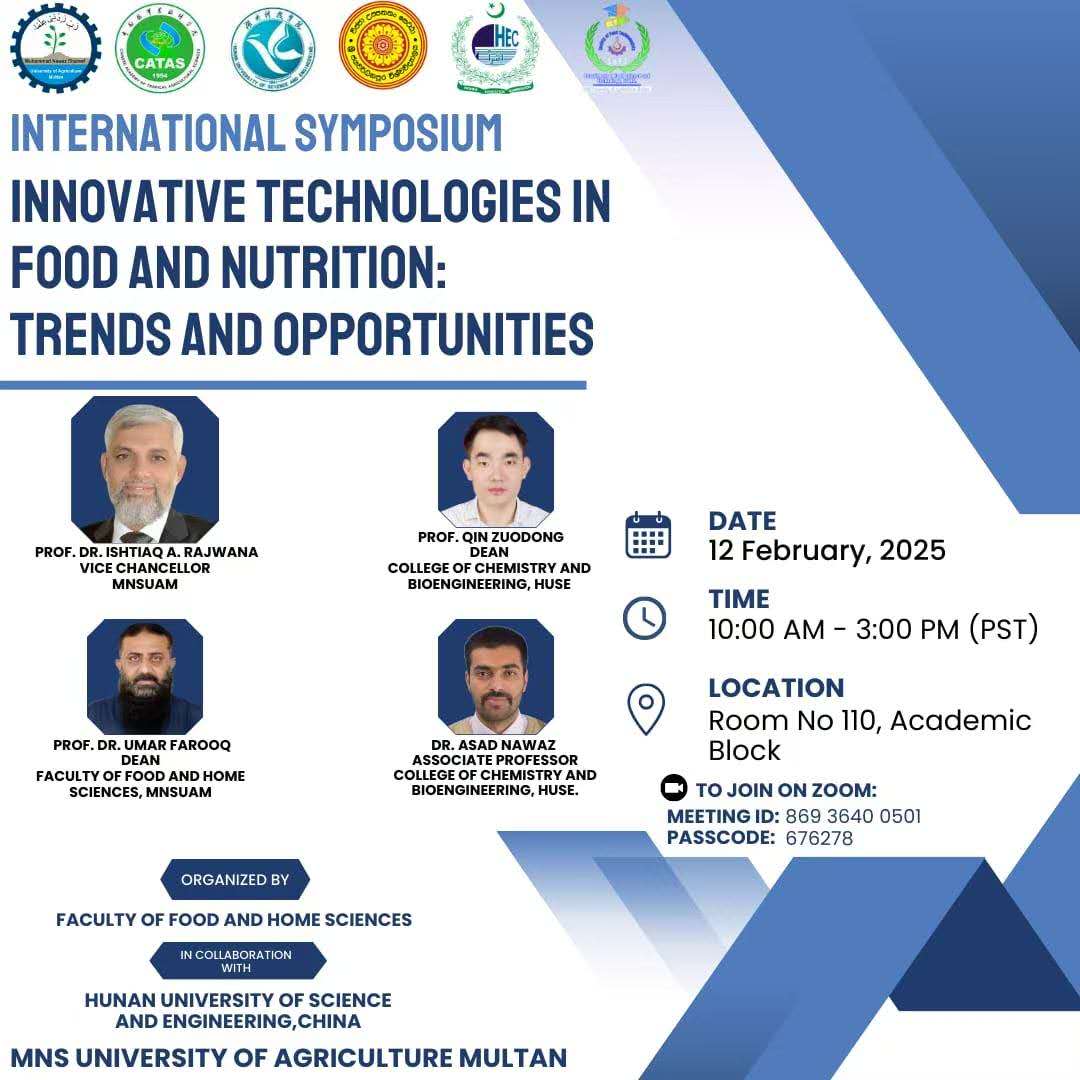 (本网讯 汪美凤)2月12日,由巴基斯坦 Muhammad Nawaz Shareef University of Agriculture 联合我校组织发起的“Innovative Technologies in Food and Nutrition: Trends and opportunities”(食品与营养创新技术:趋势与机遇)国际研讨会在巴基斯坦木尔坦以线上线下相结合的方式成功召开。来自巴基斯坦、中国、斯里兰卡等国家和地区的百余名专家学者出席了本次研讨会,共同探索食品营养的最新技术与未来发展趋势。