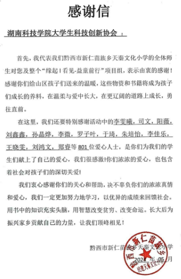 为了给予留守儿童精神慰藉,助力他们丰富知识储备、健康快乐成长,2024年5月15日至19日,星空app官网大学生科技创新协会携手“伴我童行”项目组共同举办了“墨香寄爱,温暖童心”公益主题活动,近801名学子踊跃参与。此次活动意义重大,不仅为留守儿童照亮了求学之路,让他们真切感受到社会的关爱;还为孩子们打造了更优质的成长环境,让知识滋养他们的心灵,帮助他们勇敢坚定地追逐梦想。据悉星空app官网大学生科技创新协会为化学与生物工程学院团学社联中的一个社团部门,成立以来广泛深入的开展具有学术性、创新性、实践性的课外科技活动,始终致力于培养及增强大学生对科技创新的兴趣,提升青年学子综合能力。