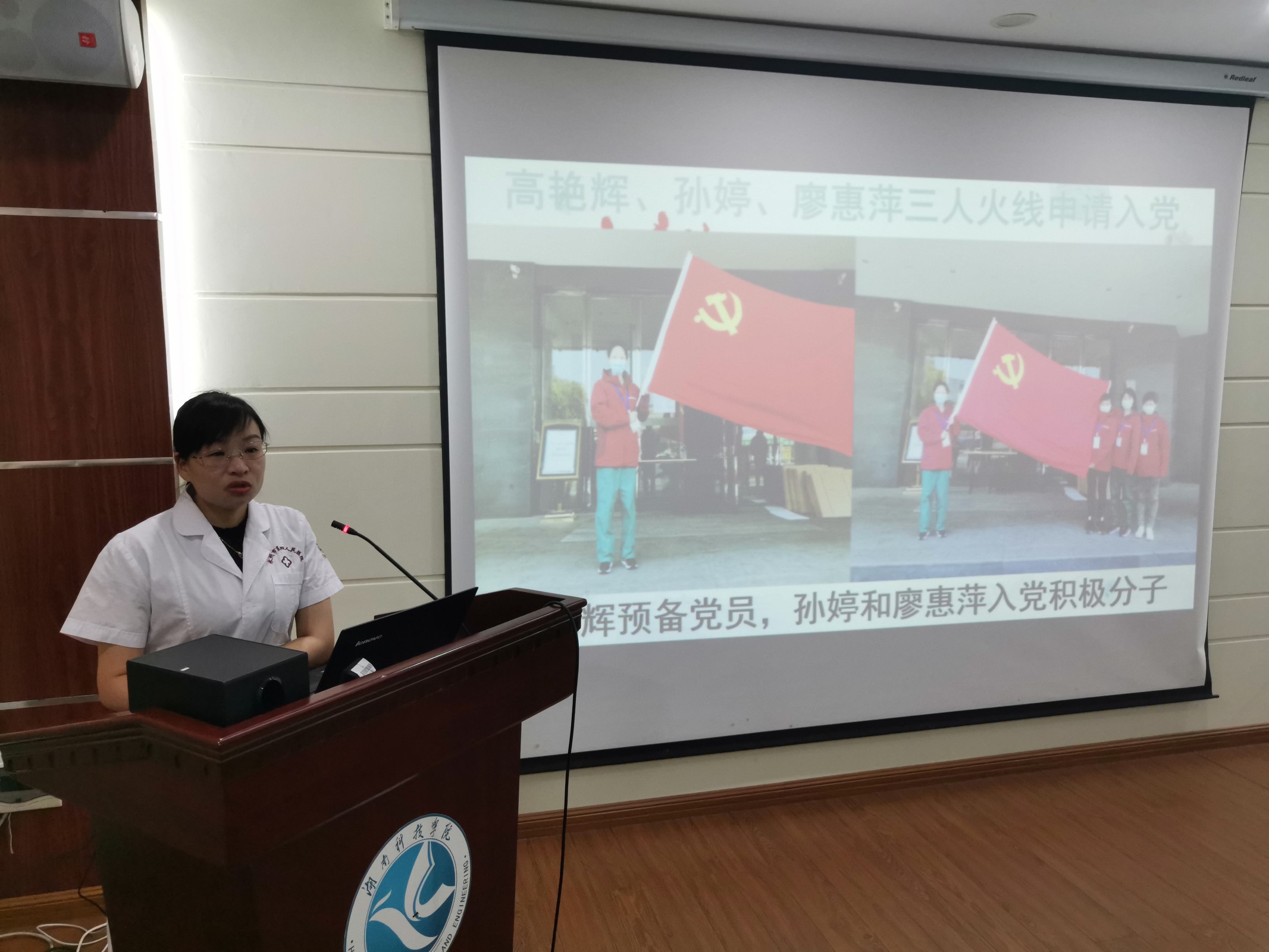 本网讯 (通讯员 周爽) 为进一步锤炼党员党性修养、激发干事创业热情,6月29日,星空app官网化生学院党总支和传媒学院党总支在逸夫楼320会议室组织开展了一堂特殊的党课——邀请湖南省第三批援鄂抗“疫”英雄永州市第四人民医院重症医学科护士长高艳辉和护士廖惠萍分享她们的抗“疫”故事。
