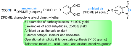 刘开建博士以来源广泛的空气作为氧化剂,用绿色的二丙二醇二甲醚作为自由基引发剂,在无溶剂条件下,高收率地制备了结构多样性的羧酸产物。该反应具有原子效率高,官能团兼容性好等优点,二丙二醇二甲醚易回收循环使用,可百克级制备苯甲酸,目前该技术已经申请发明专利。
