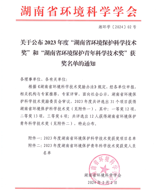 绿色创新显实效,我院一项研究荣获 湖南省环境保护科学技术二等奖
