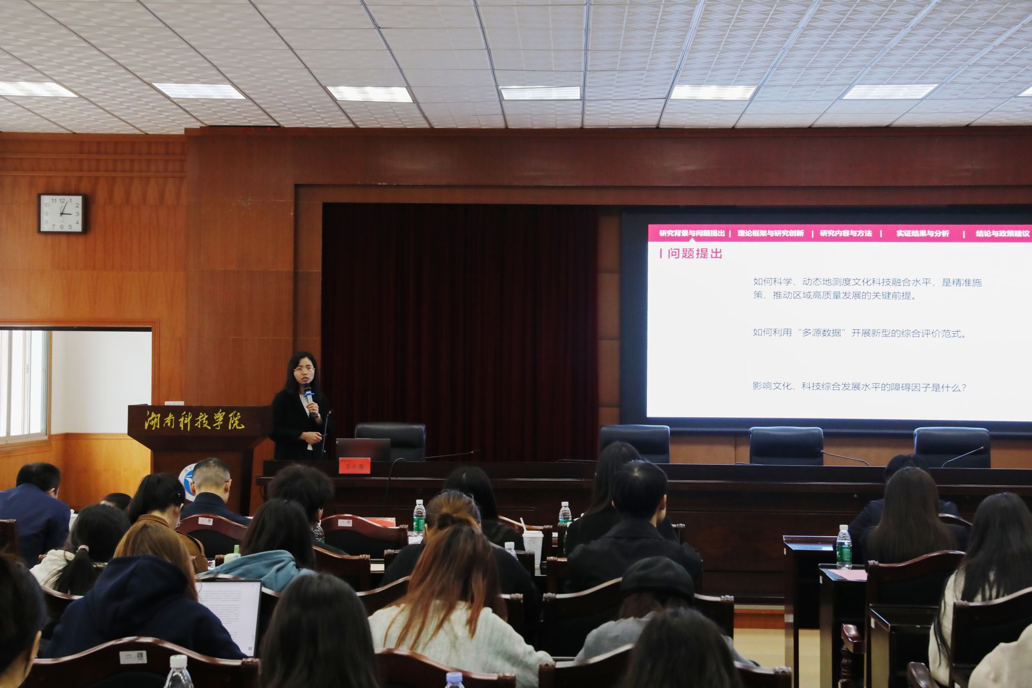 在交流发言环节,湖南农业大学经济学院郑毅以《科技赋能传统文化与旅游融合的机制构建与路径选择——以永州为例》为题,中南林业科技大学涉外学院禹文婷以《湖南省文化-旅游-数字产业发展态势与耦合协调研究》为题,湖南省社科联机关党委(人事部)杜宏丹以《AIGC的赋能与颠覆:文化产业内容生产的范式重构》为题,湘潭大学商学院闫宇晨以《制度型开放对城市创业的影响研究:来自跨境电商综合试验区的经验证据》为题,湘潭大学商学院周海欣以《数字普惠金融对制造业韧性的空间溢出效应研究——产业协同集聚的调节作用》为题,中南林业科技大学经济管理学院孙颖以《长江经济带文化与科技“两业融合”的产业升级效应研究》为题,湖南都市职业学院李茜以《音视频产业赋能湖南文化资源数字化发展研究》为题,湘潭大学法学学部扶紫媛以《民事诉讼中表情符号作为证据适用的现实困境与规范路径》为题,星空app官网蔡保忠以《数字文旅促进城乡共同富裕:作用机理与效应分析——基于中国县域面板数据的实证研究》为题,分享了文化和科技融合发展的研究心得与实践感悟。