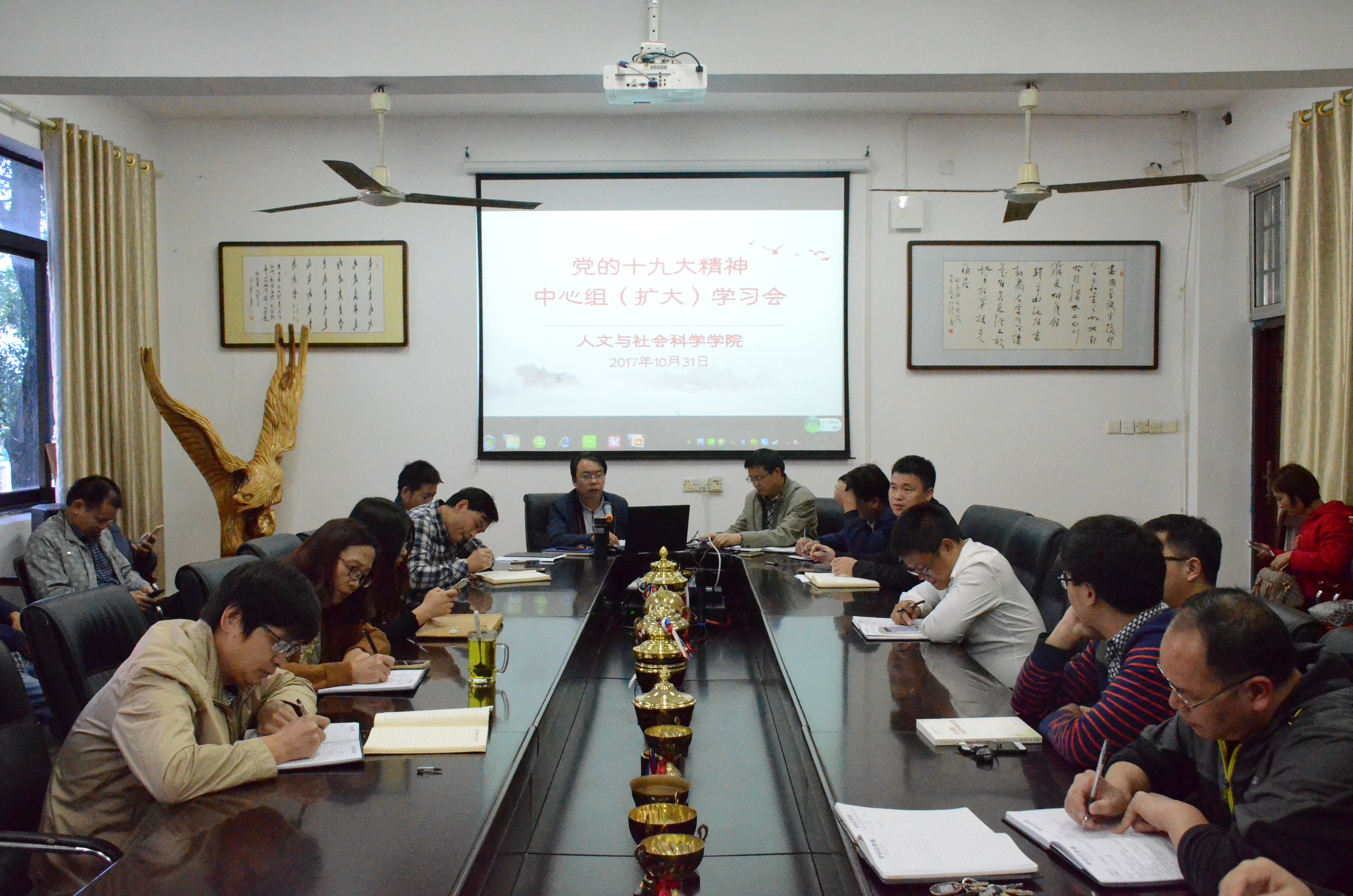 本网讯 为全面系统地学习贯彻十九大精神,增强全院教师对十九大报告思想内涵和要义的理解,10月31日下午,人文与社会科学学院在明德楼举行党的十九大精神中心组(扩大)学习会。该院院长潘雁飞主持会议,党总支书记谷显明作十九大精神辅导报告。