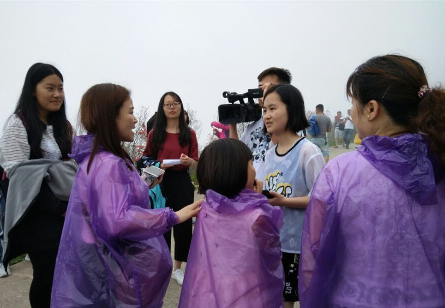 北有庐山,南有阳明,位于永州双牌县的阳明山风景秀丽,山水和美。学生以“记者”的身份来到阳明山,发掘阳明山独特之美,把主题做好,把新闻做精。同学们分工协作,三五人一组,摄像、采访各司其职,大家围绕主题进行采访实践,努力把课堂上的理论运用到实践中。