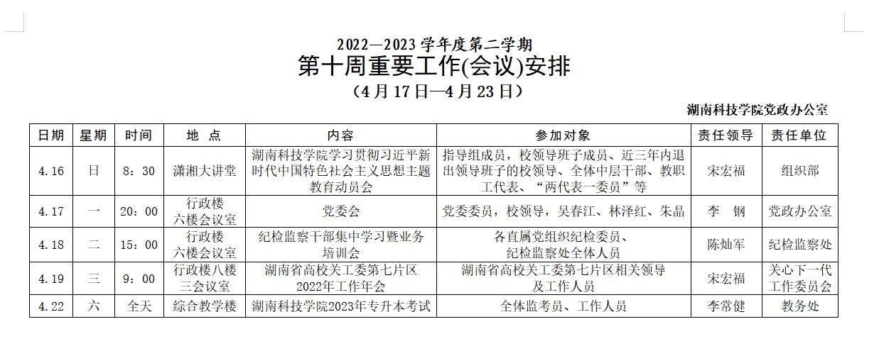 [党政办]第十周重要工作(会议)安排(4月17日—4月23日)