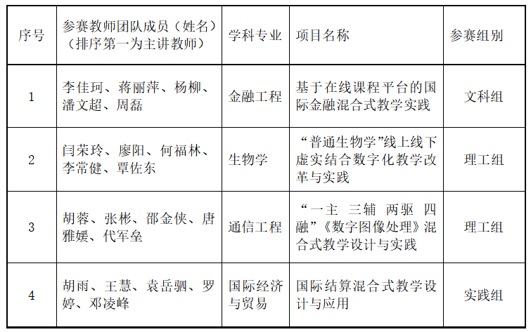 根据省教育厅《关于开展2024年第十三届湖南省普通本科高校教师数字化教学竞赛的通知》和《关于举办星空app官网2024年教师数字化教学竞赛暨湖南省高校教师数字化教学竞赛参赛教师选拔赛的通知》(湘科院教发〔2024〕14号)文件精神要求,经各学院推荐,学校进行资格审查后决定,拟推荐李佳珂、闫荣玲、胡蓉、胡雨等四位老师为主讲教师的4个教师团队参加2024年湖南省普通本科高校教师数字化教学竞赛。现予以公示: