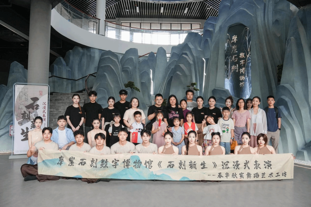 “我们第一次来到摩崖石刻数字博物馆,就被这里深厚的文化底蕴所打动,当时就下定决心,要以场馆为舞台,以碑刻文化为主题创作一部舞蹈作品。”作品融合舞蹈、戏剧、数字媒体等多种艺术形式,叙述了大学生小李参观摩崖石刻数字博物馆的所见所闻,从参观者的视角欣赏摩崖石刻的历史渊源,讲述传统人文精神的现代故事,展望数字科技助力文化传承。观众在小李的引导下,在各个展区间移动,尽享全景式沉浸、一步一景的独特观演体验。