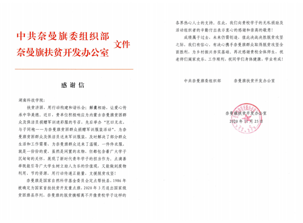 10月30日中午,校团委书记万李、理学院党总支书记刘华、理学院党总支副书记欧阳素勤参加军训服捐献仪式。永州市义工协会会长王宗清向共青团星空app官网委员会敬赠锦旗。从新生军训场上退下的迷彩服即将开启一段新的旅程,将“奉献、友爱、互助、进步”的志愿精神传承发扬。