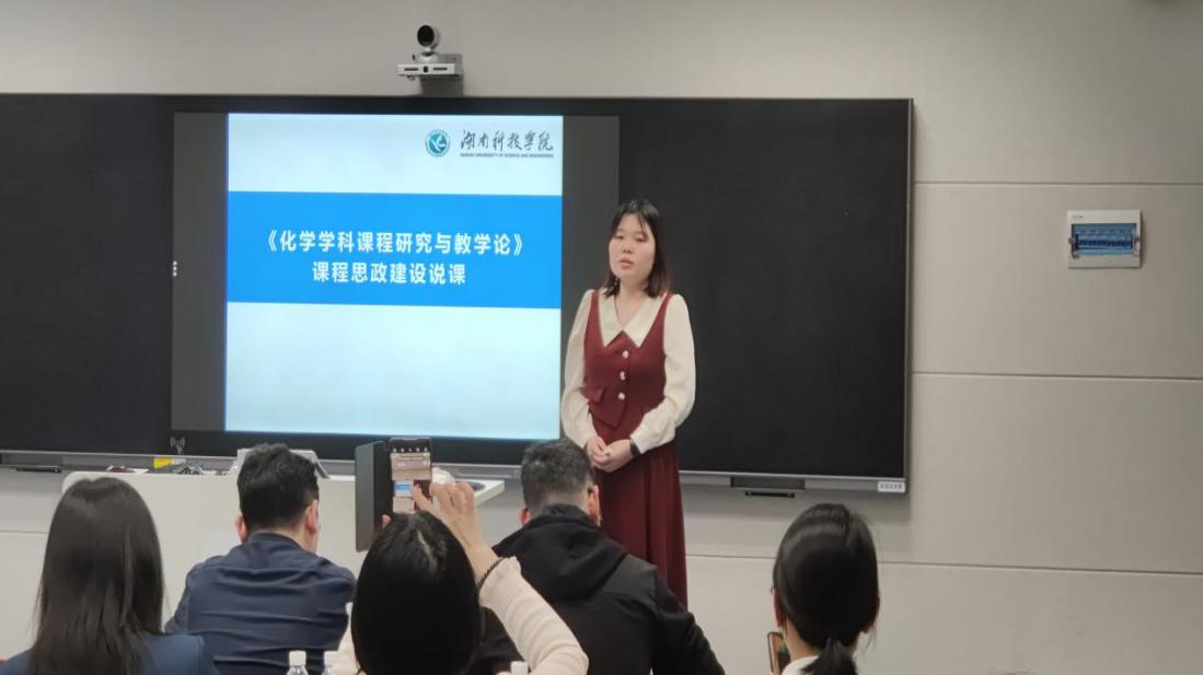 本网讯(通讯员:唐鼎 阳灿)为引领课程思政、发挥课堂教学主阵地,进一步落实立德树人根本任务,同时为学校选拔优秀教师参加湖南省普通高等学校课程思政教学竞赛,化生院与理学院4月11日下午3点在逸夫楼403智慧教室联合举办课程思政教学竞赛交流会。交流会邀请化生院和理学院的领导和专家们担任点评嘉宾,2023年课程思政课程教学竞赛5名参赛教师依次上台展示。