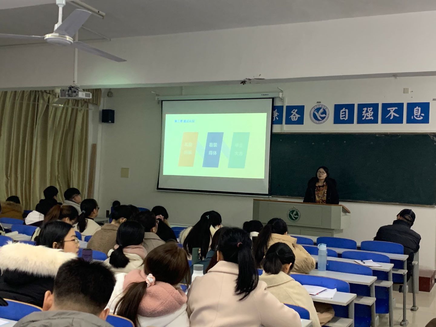 本次培训分为面试讲座和面试测评两个环节。首先,由培训机构的专业讲师唐晓艳对面试流程、评分标准、面试礼仪三方面进行了专门的传授。讲座结束后,学生分为六组到不同的教室进行了面试测评,首先是结构化提问,考官提出两个随机抽取的问题,待考生回答完毕后,再进行试讲。试讲结束后,考官对每个考生逐一评价,强调了时长、互动、语音语调、气场等问题,并提出了建议。考生也向考官提出了自己的问题,考官逐一进行了解答。面试测评过程中氛围融洽,同学们积极性很高。