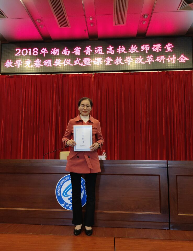 由湖南省教育厅、湖南省教育工会主办,长沙理工大学协办的2018年湖南省普通高校课堂教学竞赛于10月27日落下帷幕,理学院应用数学系廖春艳老师对《高等数学》课程中的知识点“曲率”进行了现场授课,内容新颖,讲解深入浅出,荣获理科组一等奖及省教学能手称号。