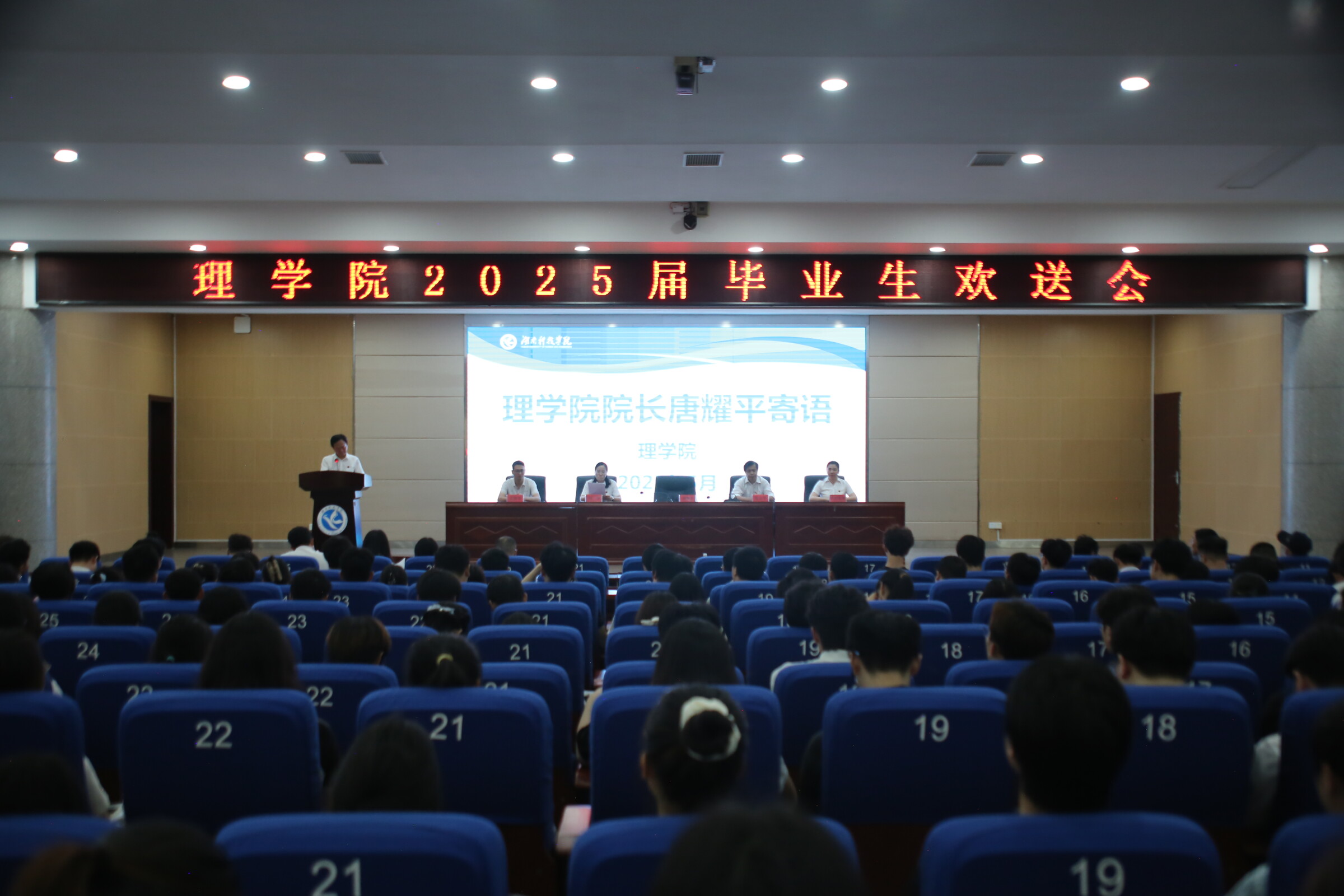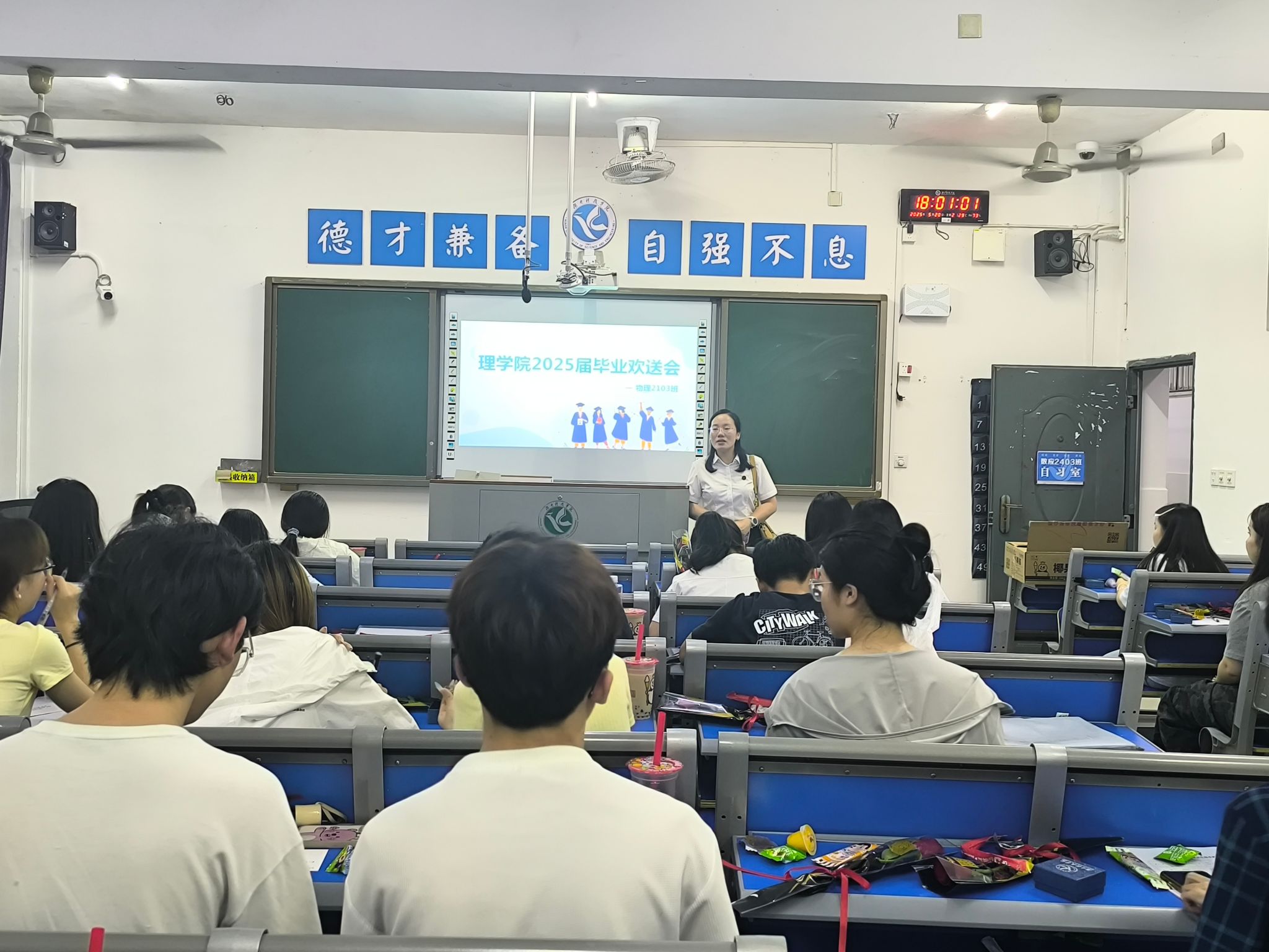 欢送会伊始,一段精心制作的毕业生祝福视频拉开序幕。老师们一改常态,摇身一变土味情话男女主角老师你去干啥?我去上课啊,喜欢你们的时时刻刻”“老师您早上吃的啥?我喝的粥,想你们的每一周等幽默金句引发阵阵欢笑,将四年点滴化作会心一笑的温暖回忆。理学院院长以三个坚守勉励学子:坚守诚信本分的立身之本,坚守社会责任的担当之志,坚守终身学习的进取之心祝福理学院2025届全体毕业生以梦为舟,乘风破浪;以理为帆,直济沧海。毕业生代表物理2103班颜芳萍在发言中细数成长印记:疫情期间师生共同打造的疫剪没解决学生的“头等大事”,理学院篮球队勇夺桂冠的激情时刻,串联起独属于理院学子的青春叙事。在离校事项布置环节,龙枚樱通过清晰表格解读手续办理流程,让数据多“跑路”,同学们少跑腿,打通毕业生离校的最后一公里