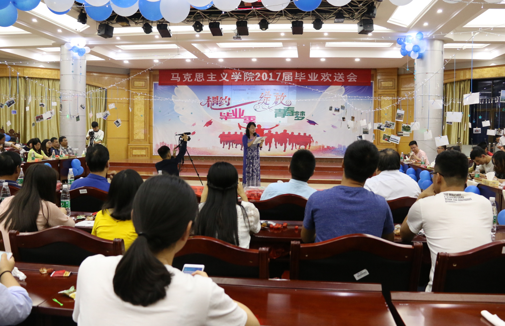 本网讯 (通讯员张金灵)6月6日晚,马克思主义学院在明德楼二楼报告厅举行“时光不老,我们不散”2017届毕业生欢送会,校党委副书记唐艳明,校党委委员、纪委书记彭立威,发展规划与学科建设处处长潘剑锋,该院院长廖雅琴,党总支书记唐森树出席欢送会。