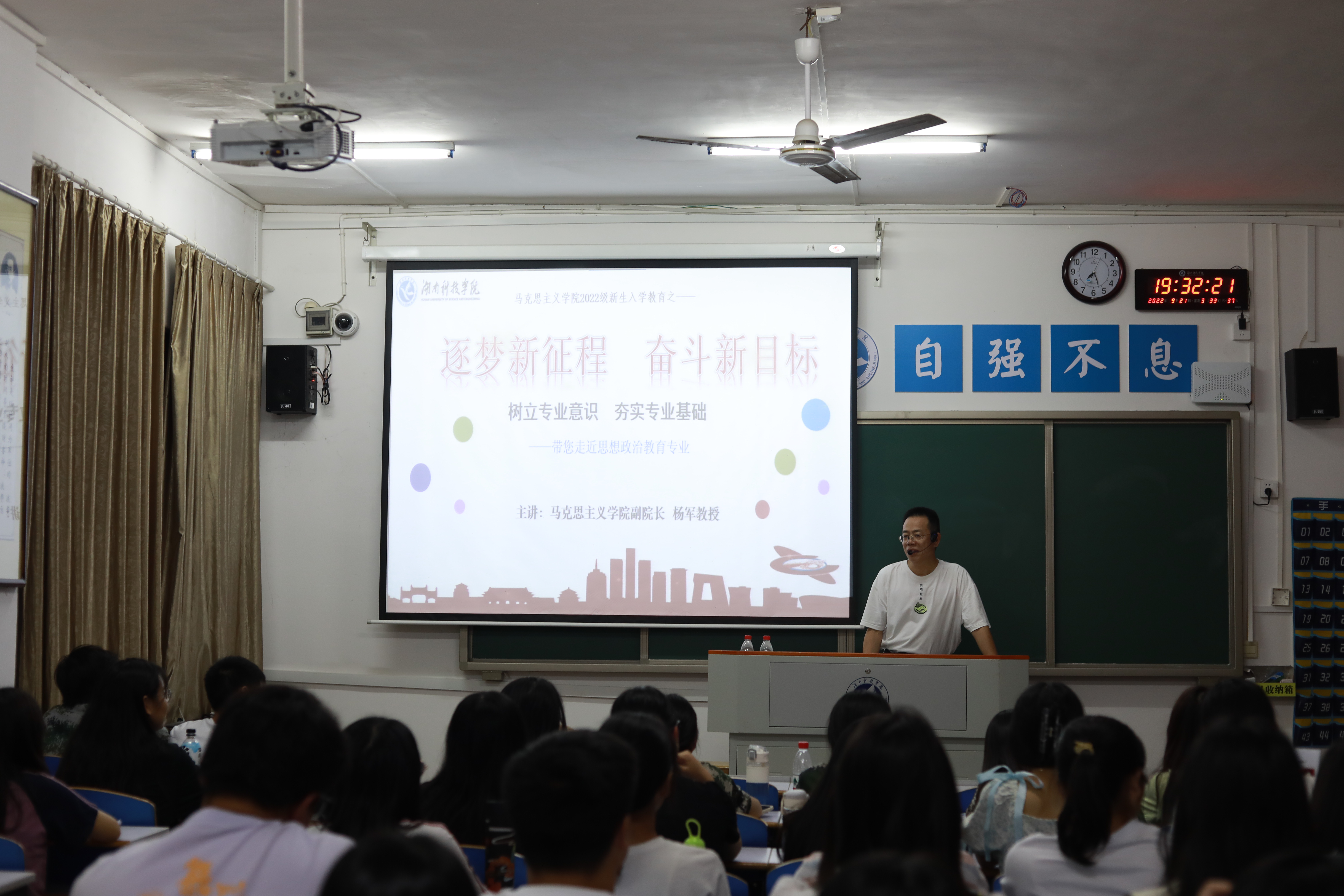 本网讯(记者 王婧)为进一步引导2022级新生深入了解专业学科,明确学习目标,提高专业知识学习兴趣,9月21日,马克思主义学院于鹤鸣楼406教室举行新生入学教育——“逐梦新征程,奋进新目标”讲座。此次讲座由马克思主义学院副院长杨军主讲,22级全体同学参加。