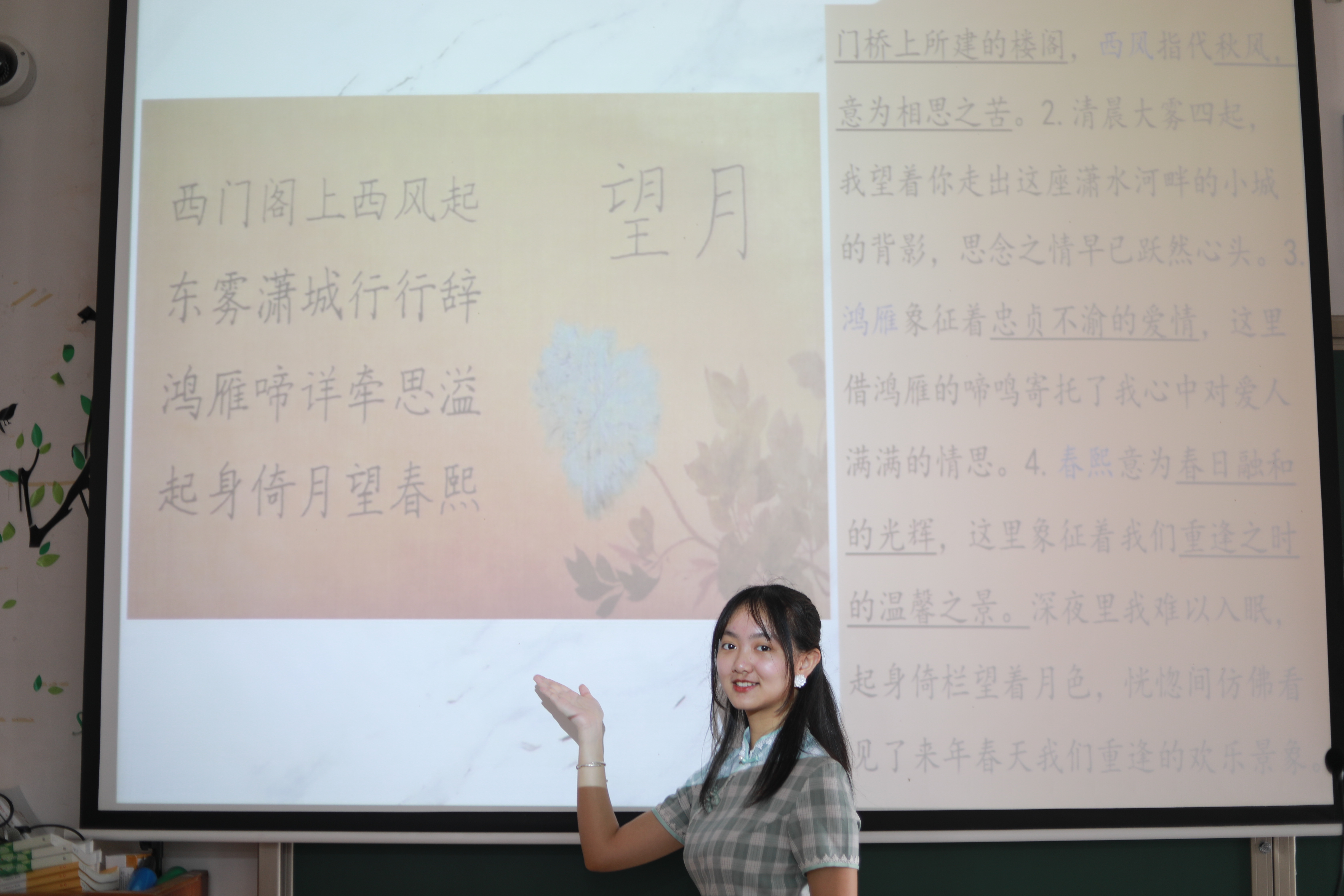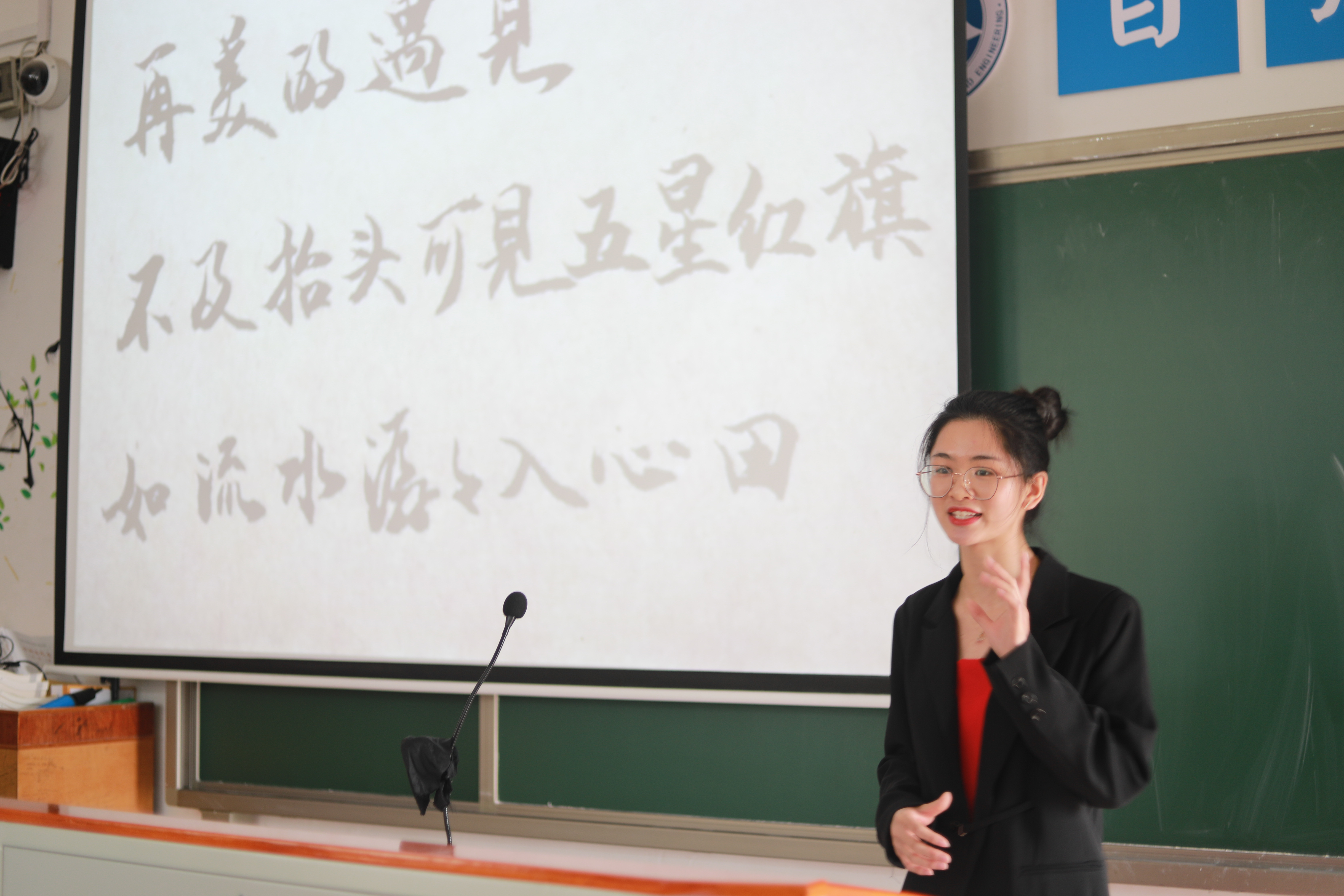 15组参赛选手依次展示并讲解了自己的书法作品。周灵敏组借海棠花、七里香的花语和西风、鸿雁等意象,抒发了心中说不尽的情思;曾洁银组以中国“红”为主基调,将一片赤子之心,满腔爱国热情寄托于对五星红旗的无限敬仰之中;邓雨双组以爱莲湖、鹤鸣楼、毓秀楼这三大学校地标建筑为载体,将她们对学校的热爱与感激之情融于作品之中。
