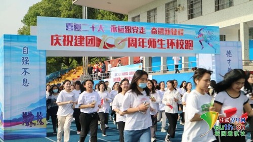 图为全体教职工从田径场起点出发。中国青年网通讯员 王慧宁 供图