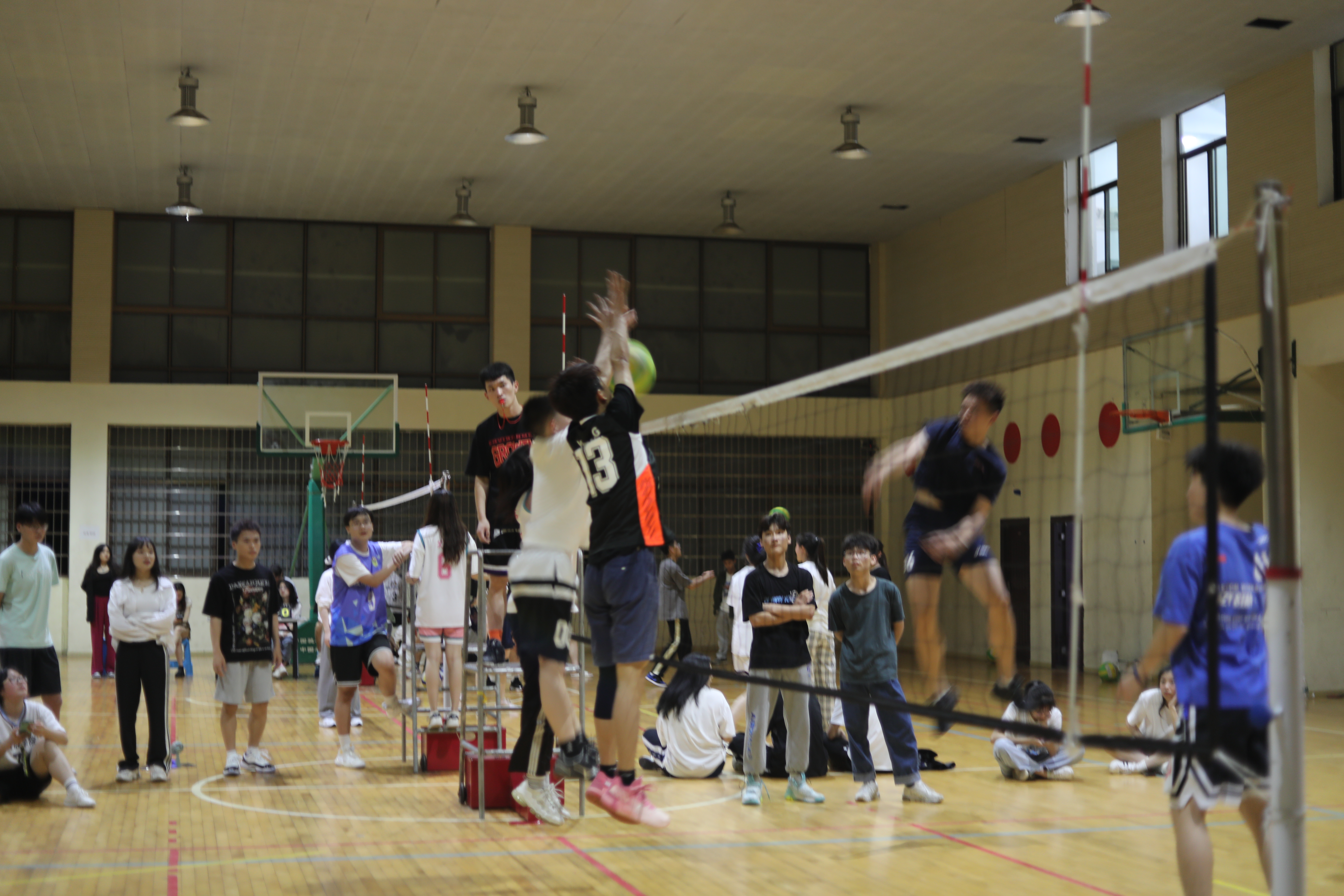 比赛场上,参赛队员们都尽力发挥出最好的水平,在赛场中汗流浃背,浑然不顾两条手臂被球硬生生砸到的淤紫,仍然奋力争先,当球在空中划出一道道抛物线,将一个个危机转化成时机,旋转、跳跃、扣杀,动作干净利落,队员们配合默契。