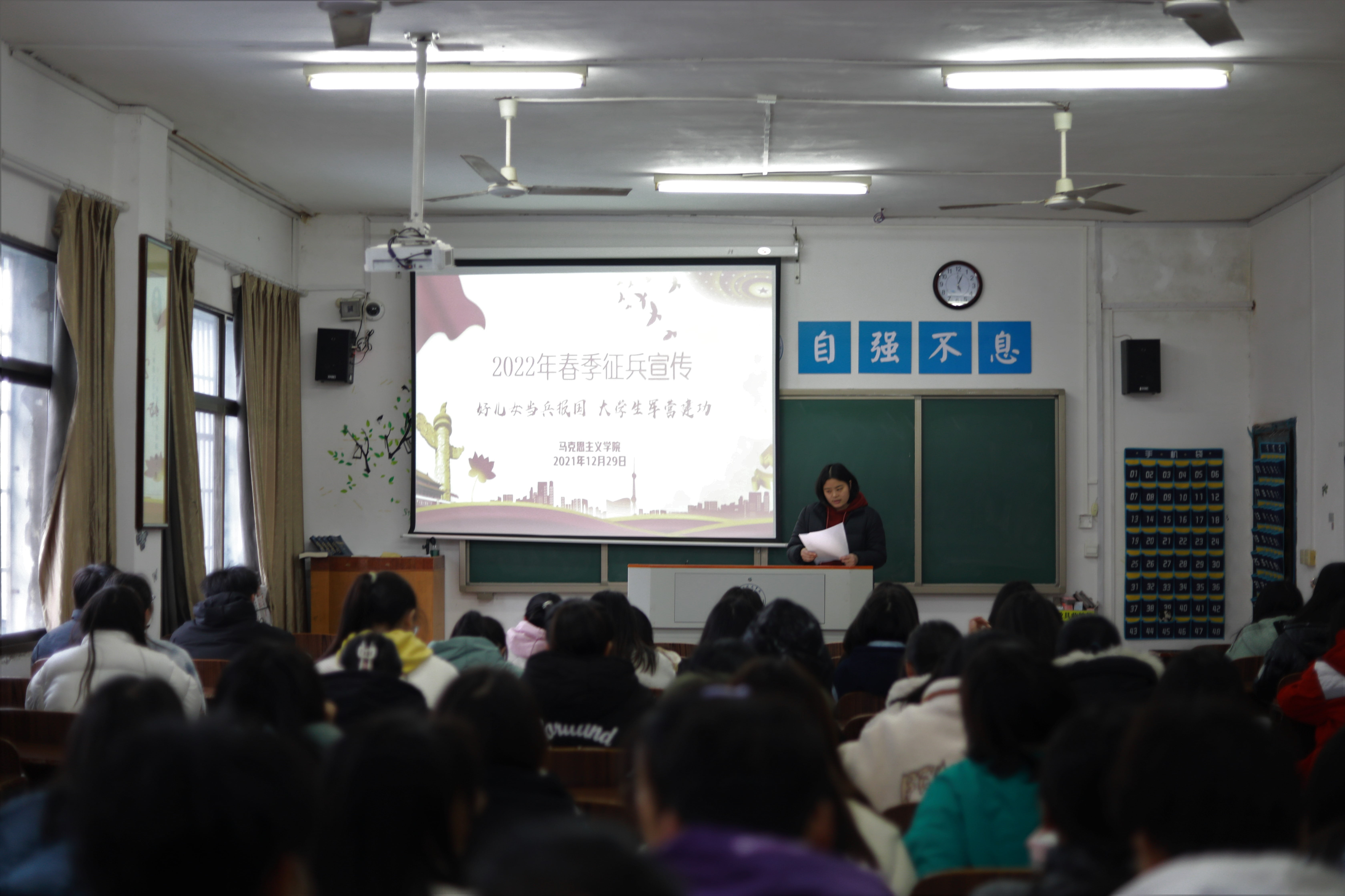 本网讯(记者 张一帆)“好儿女当兵报国,大学生军营建功。”为深入贯彻落实习近平新时代中国特色社会主义思想和习近平强军思想,12月31日,马克思主义学院于鹤鸣楼501教室举办春季征兵宣传活动。本次宣传活动由辅导员胡非主讲,20级、21级全体同学参加。