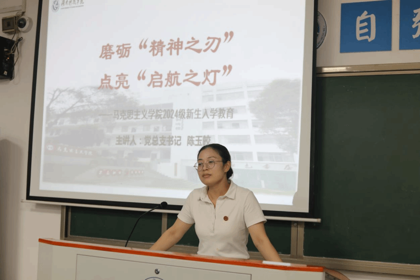 本网讯(记者 杨鑫杰)为帮助新生筑牢理想信念之基,明确人生奋斗方向,9月18日,马克思主义学院在鹤鸣楼501教室组织开展“磨砺‘精神之刃’,点亮‘启航之灯’”理想信念教育主题讲座,此次讲座由党总支书记陈玉皎主讲。