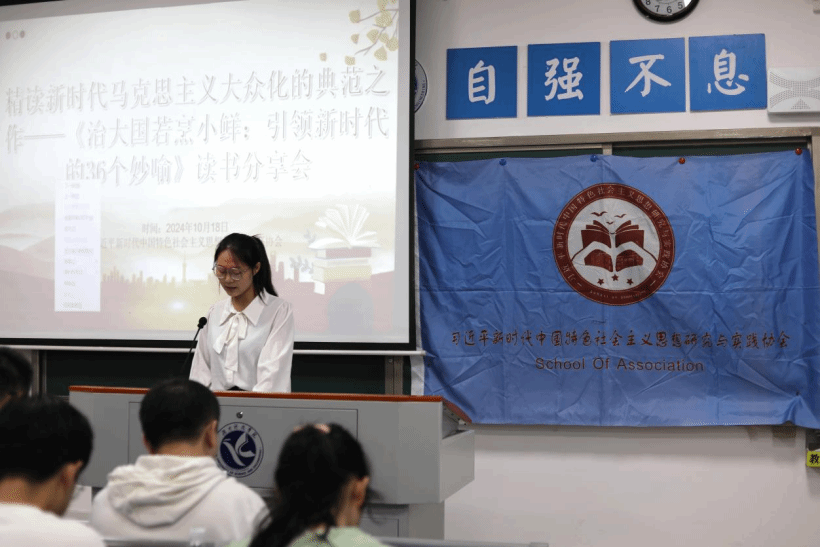 本网讯(记者 刘获逞 许圣翰)10月13日,习近平新时代中国特色社会主义思想研究与实践协会于鹤鸣楼501教室举办了以《治大国若烹小鲜:引领新时代的36个妙喻》为主题的读书分享会活动,校团委副书记全伟,协会指导老师邓昱全出席活动领学点评,协会副会长陈玲主持。