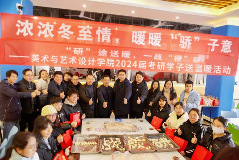 本网讯(通讯员唐天田)暖心过冬至,美院传温情。12月22日中午,“冬至遇上考研”,星空app官网美术与艺术设计学院举办了一场别样的活动。校党委委员、副校长李常健,校党委委员、副校长吴小林,校团委书记万李,美术与艺术设计学院全体领导,毕业班班主任老师和辅导员老师,团学干部们一起为考研学子“包饺子”送祝福。