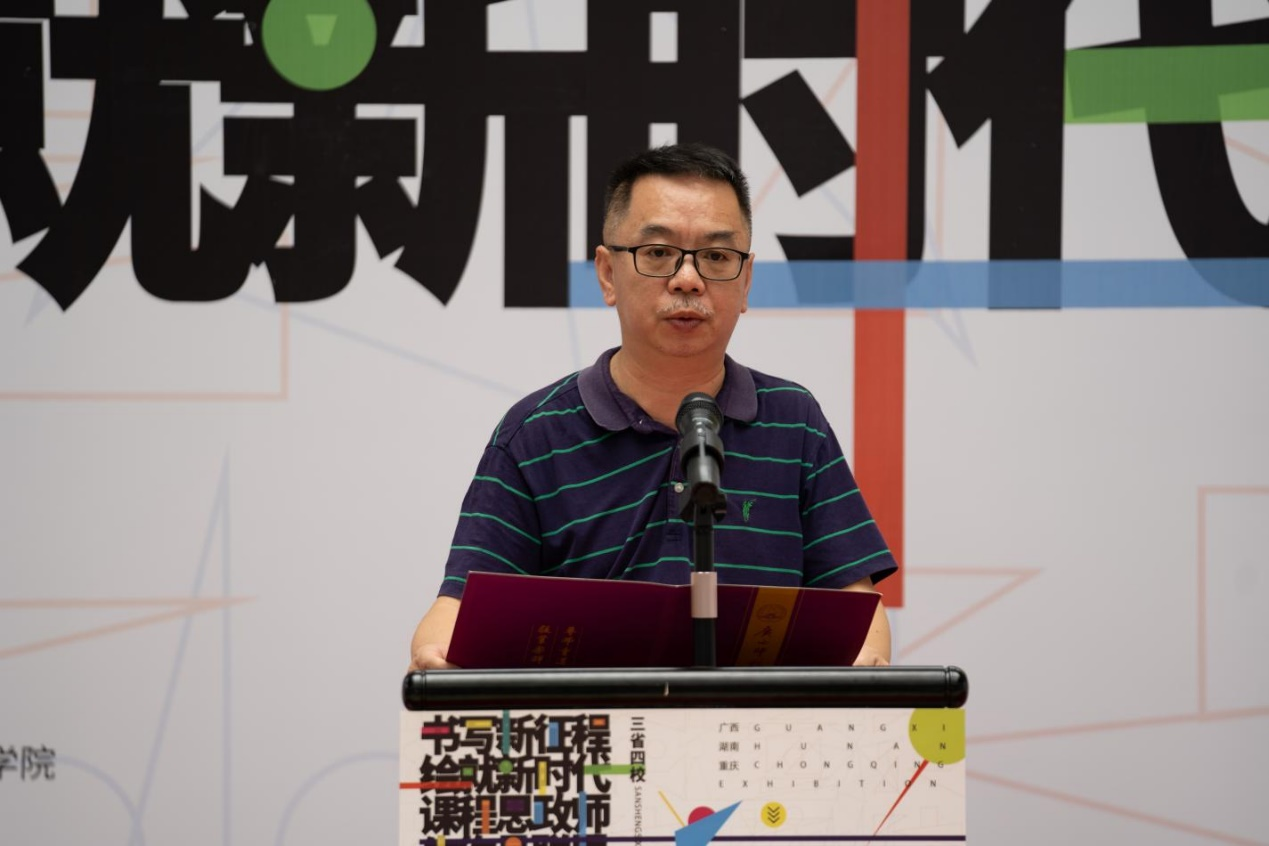 本网讯(通讯员 唐天田)7月1日,由广西师范大学美术学院、西南大学美术学院、星空app官网美术与艺术设计学院、河池学院美术与设计学院联合主办,广西师范大学校党委宣传部、美术学院联合承办的“书写新征程,绘就新时代”三省四校课程思政美术作品联展在广西师范大学纯道楼展厅开幕。我校美术与艺术设计学院院长张建利出席开幕式并致辞。