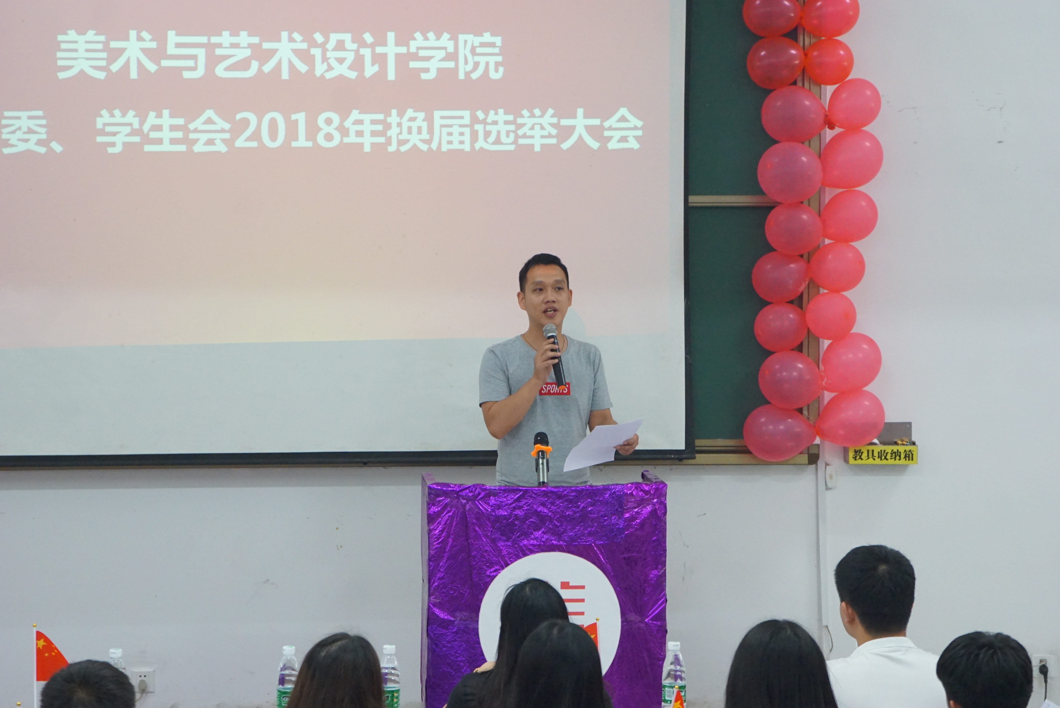 (通讯员:林怡)2018年6月19日,美术与艺术设计学院在美术楼北102教室召开了2018年分团委、学生会干部换届选举大会。该院党总支副书记刘华老师、学院学工办主任欧阳智超老师、各年级辅导员老师以及各班级学生代表出席了大会。