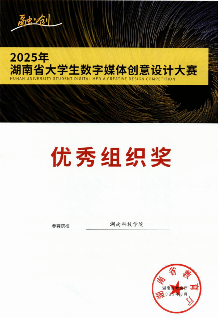 本网讯(通讯员 付星星)近日,2025年湖南省大学生数字媒体创意设计大赛获奖名单正式公布。我校美术与艺术设计学院师生凭借扎实的专业功底和卓越的创新能力,共斩获等级奖项49项,其中一等奖8项、二等奖13项、三等奖28项,获奖数量和质量均位居全省前列,并被授予“优秀组织奖”。