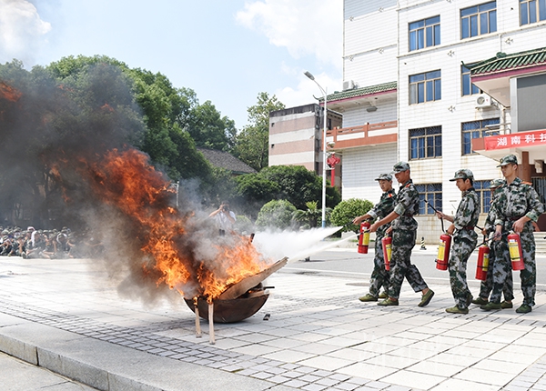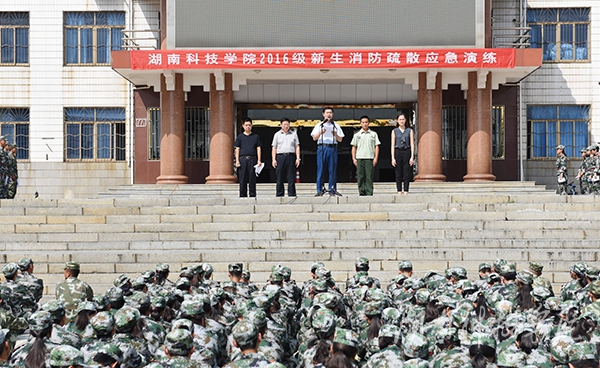 应急疏散完毕之后,零陵区消防大队队长黄小兵从报警知识、撤离技巧等方面给予了精彩点评和高度评价,同时向2016级新生演示了消防器材,如何扑灭初期火灾,火场自救等消防安全知识。