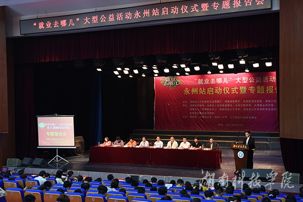 本网讯(记者 欧盼迪 裴滢 摄影何帅文)5月10日下午,湖南省2016年“就业去哪儿”大型公益活动永州站启动仪式暨专题报告会在我校举行,省内外52家企业为大学生提供就业岗位1200余个,进场求职学生1300余人,初步达成就业意向学生300余人。