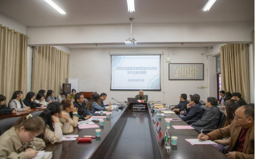 文法学院院长谷显明代表学院对于戴建业一行的到来表示热烈的欢迎。他指出,中国语言文学学科为省级应用特色学科,近年来依托丰富的地方历史文化资源,重点开展对南岭走廊与潇湘地域文化研究,学校建有湖南省舜文化研究基地、湖南省濂溪学研究基地、南岭走廊与潇湘文化研究基地、湖湘文化外译与对外传播基地、永州地域文化与文化自信研究基地等平台,形成以柳宗元为代表的古代湖湘地域文学与文化方向,以周敦颐等地方学人文献整理为代表的中国古典文献学研究方向,以湘南方言为代表的汉语言文字学研究方向,以文学与文化关系比较为代表的潇湘文艺与比较文学方向,以瑶族文化、女书文化为代表的南岭走廊民族文学与文化方向,产出了一大批有影响的学术成果。