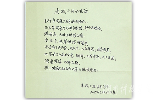 四位老人中,已是耄耋之年的退伍军人张百谷老人,是我校目前健在的最高龄老战士。他激动地回忆起自己的从军经历和学校的建设发展,提及党和国家对自己的关怀,他拿出了自己深夜执笔的《老战士的心里话》,“谋国是,大政方针很正确;安天下,运筹帷幄智慧多”,张百谷老人对党和国家的兴旺发达由衷地竖起了大拇指,他告诫大家要继续“谦虚谨慎,不骄不躁,将中国特色社会主义事业继续推进”。