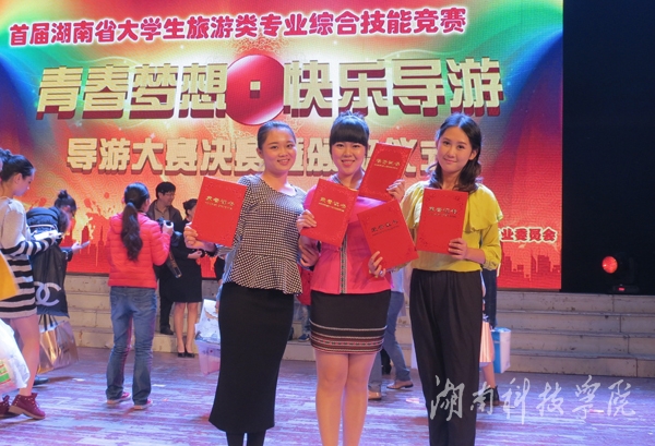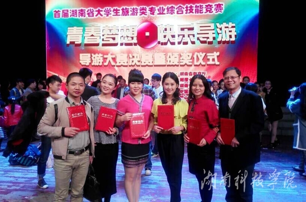 本网讯(经管系供稿)近日,从首届湖南省大学生旅游类专业综合技能竞赛传来喜讯,我校由周慧玲老师、姚先林老师、王豪才老师指导的经管系旅管专业彭娜、龙以洵、陈学丽三名同学在全省各大高校的激烈角逐中,过关斩将,脱颖而出。其中彭娜、龙以洵荣获一等奖,陈学丽获二等奖,彭娜获最佳才艺奖,龙以洵获最佳风采奖。我校荣获优秀组织奖,获奖总数位列全省第一。