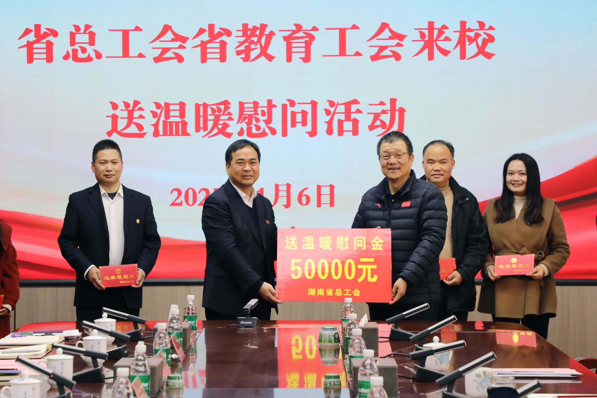 本网讯(记者 孙淑娴 摄影 谢志豪)1月6日,省总工会党组成员、省教育工会主席刘湘凌一行来我校开展“两节”送温暖慰问活动,省教育工会副主席邓曼,市总工会党组书记、副主席乐家茂等人陪同参加。校党委书记李钢、校长黄创霞、副校长李常健、原副校长吴小林等参加座谈会。