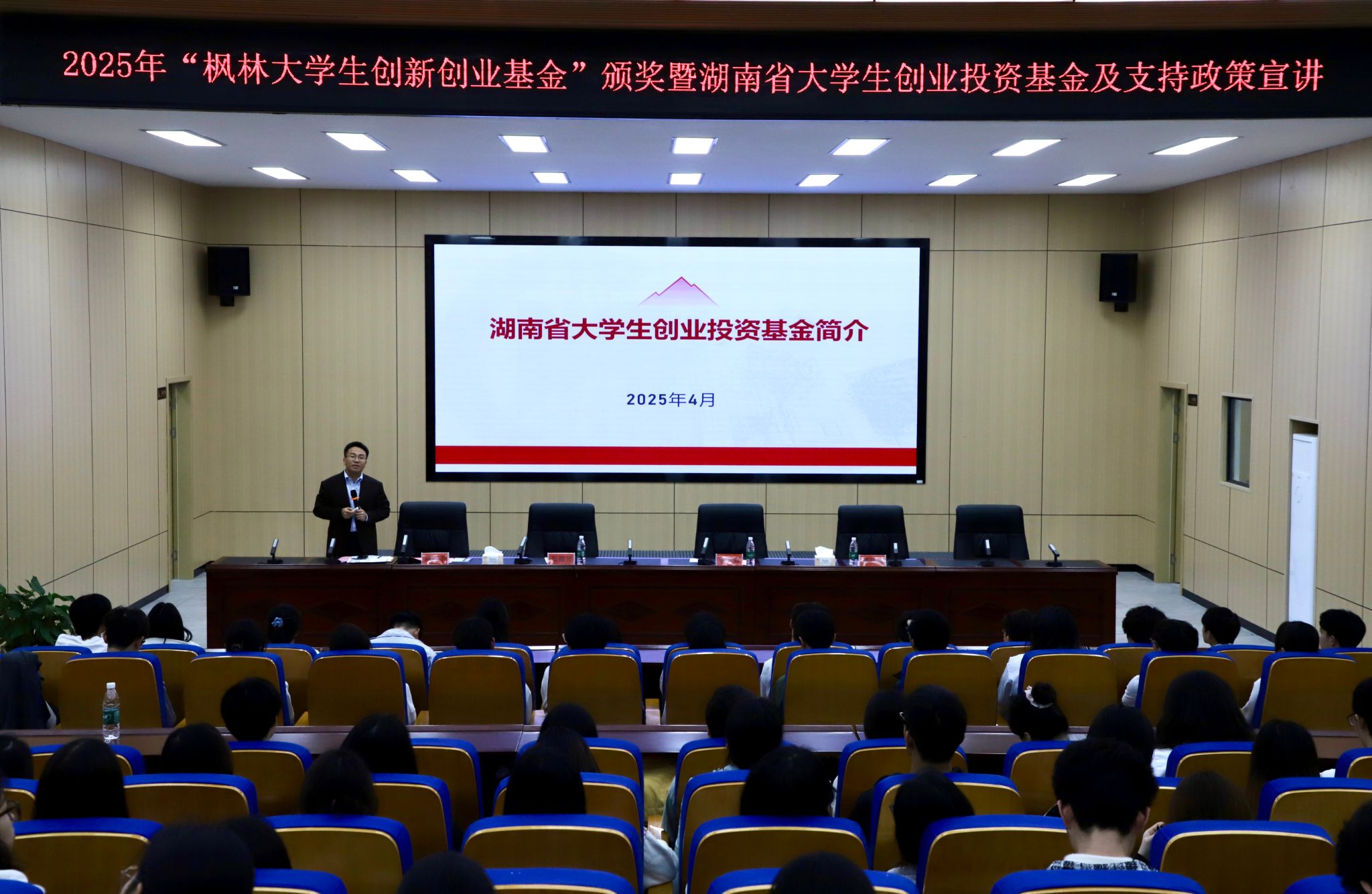 本网讯(记者 刘斌 唐晶 摄影 潘加)4月7日,2025年“枫林大学生创新创业基金”颁奖仪式暨湖南省大学生创业投资基金及支持政策宣讲活动在我校举行。我校77级校友、北京枫林公益基金会会长张亚红,副校长郑银芳出席活动,34个获基金资助的学生创业项目负责人、指导老师代表以及相关工作人员参加。