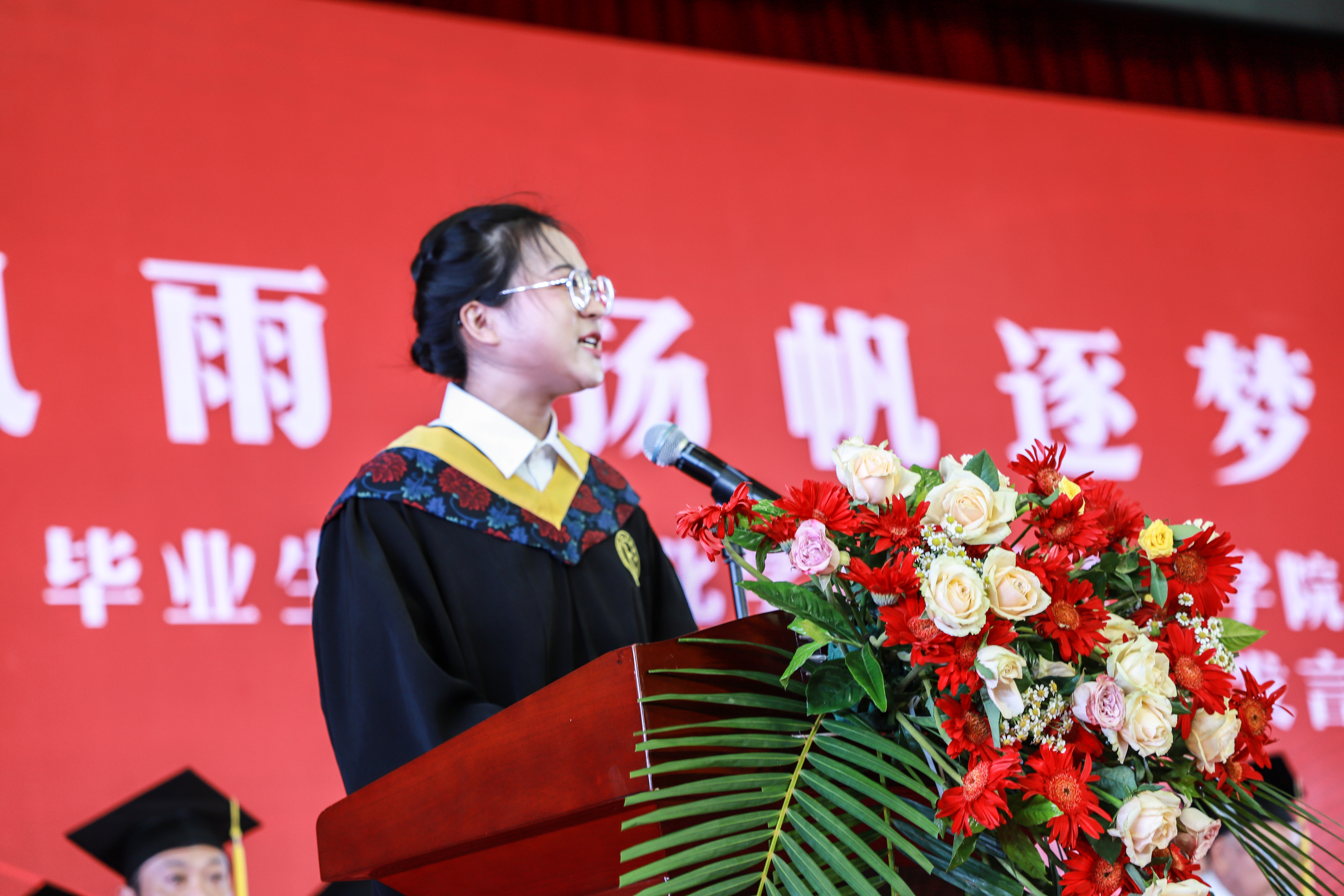 毕业典礼在雄壮嘹亮的国歌声中拉开序幕。