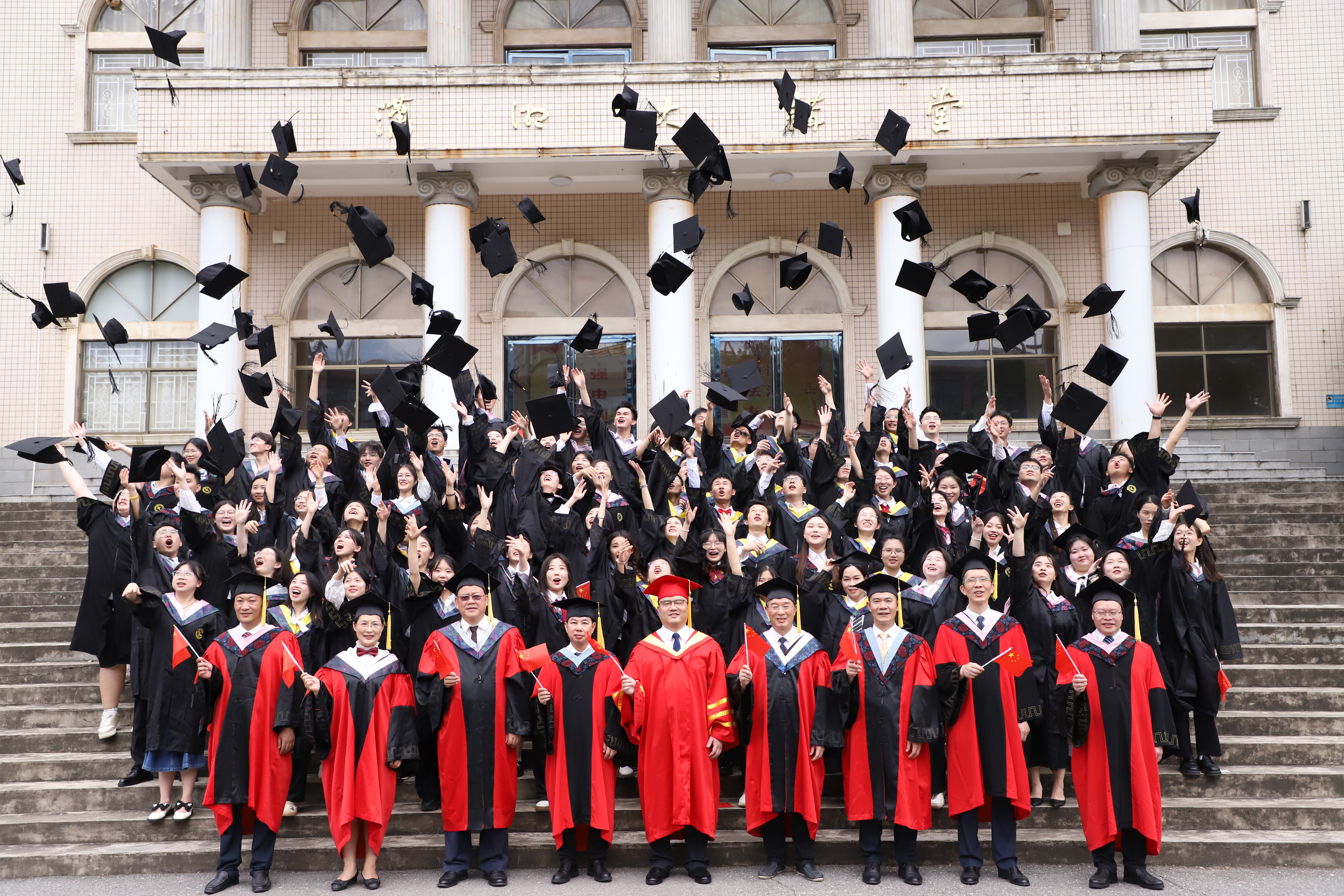 学位授予仪式上,全体校领导为毕业生拨穗,颁发毕业证书,并与毕业生合影留念,为他们的大学四年划上了圆满的句号。