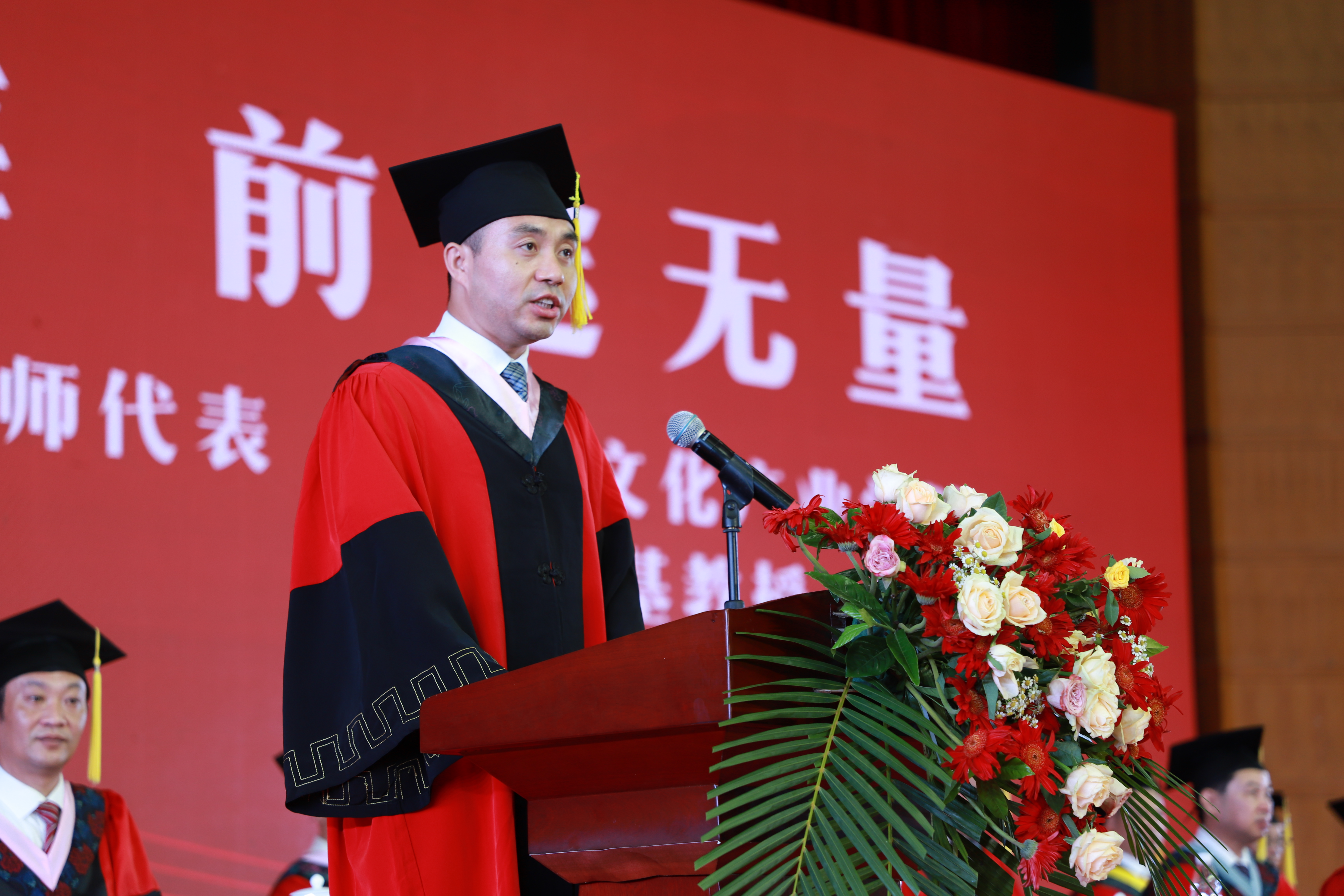 旅游与文化产业学院院长黄渊基代表学校全体教师为2023届全体毕业生送上最真诚的祝福。他希望毕业生怀抱理想、认真学习、努力工作、热爱生活,拒绝躺平、迎难而上,翻越一座又一座“浪浪山”,重整爱的行囊,奔赴新的远方!