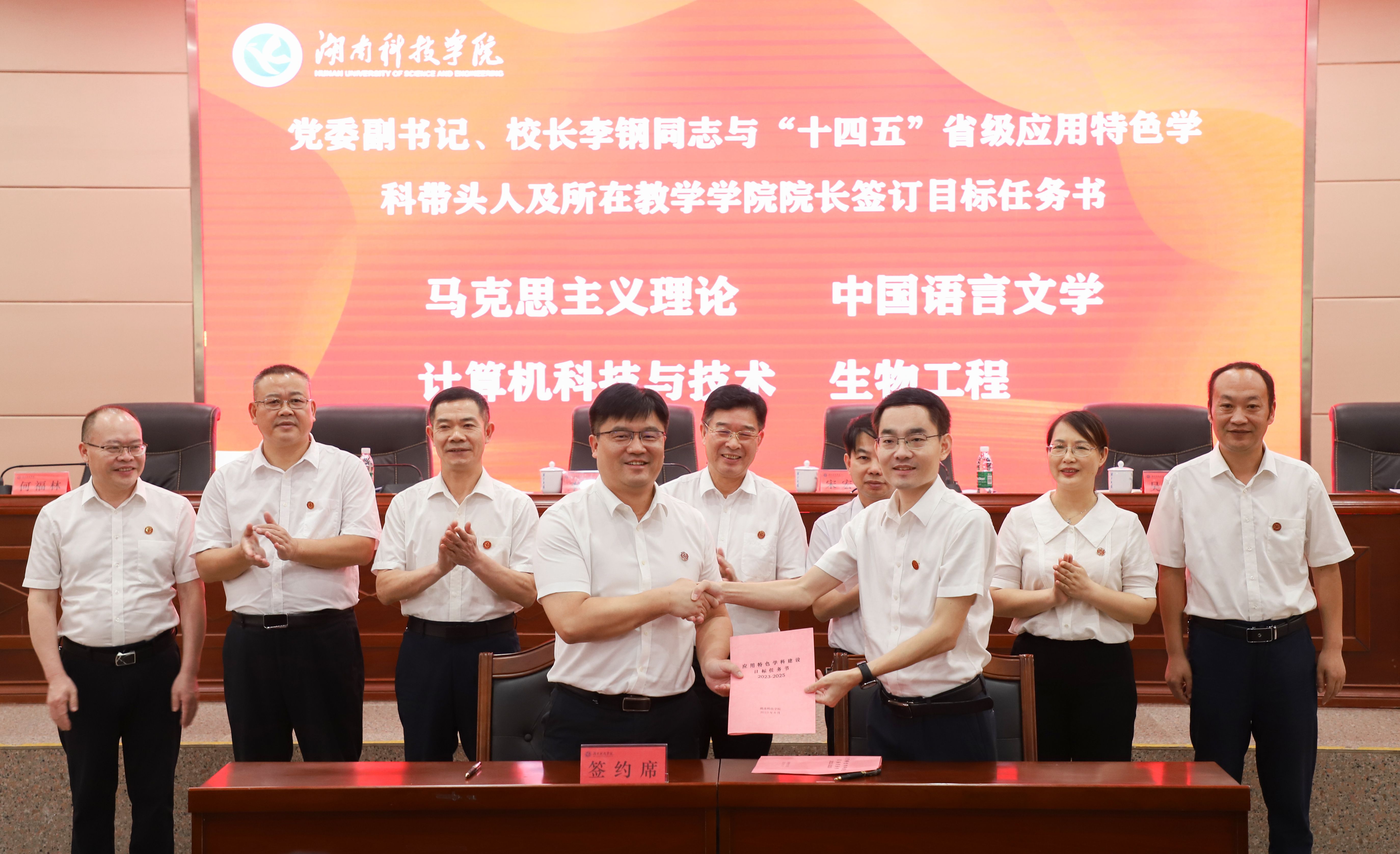现场,李钢与“十四五”省级应用特色学科(马克思主义理论、中国语言文学、计算机科技与技术、生物工程)带头人及所在教学学院院长签订了目标任务书。