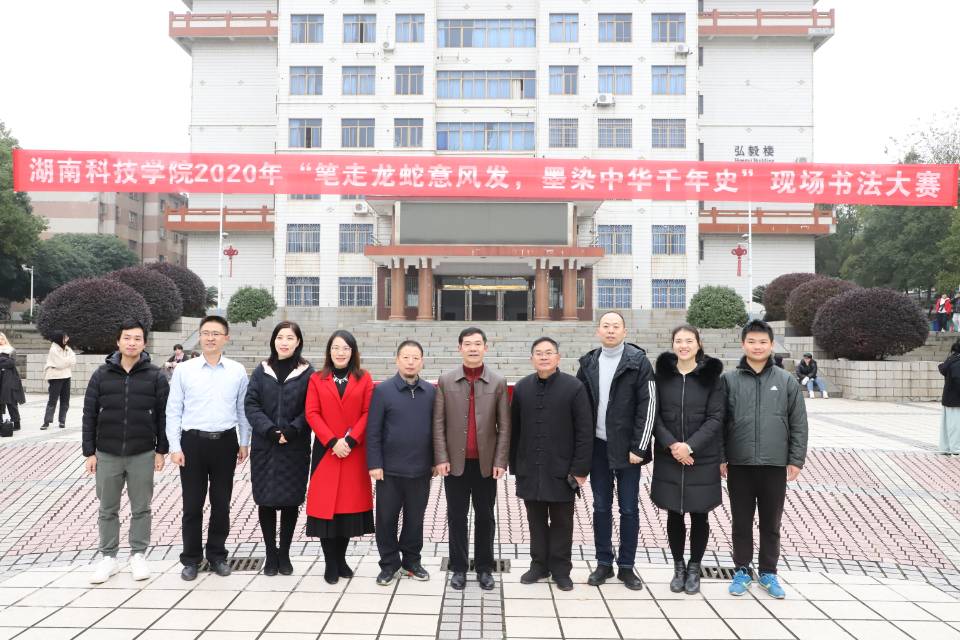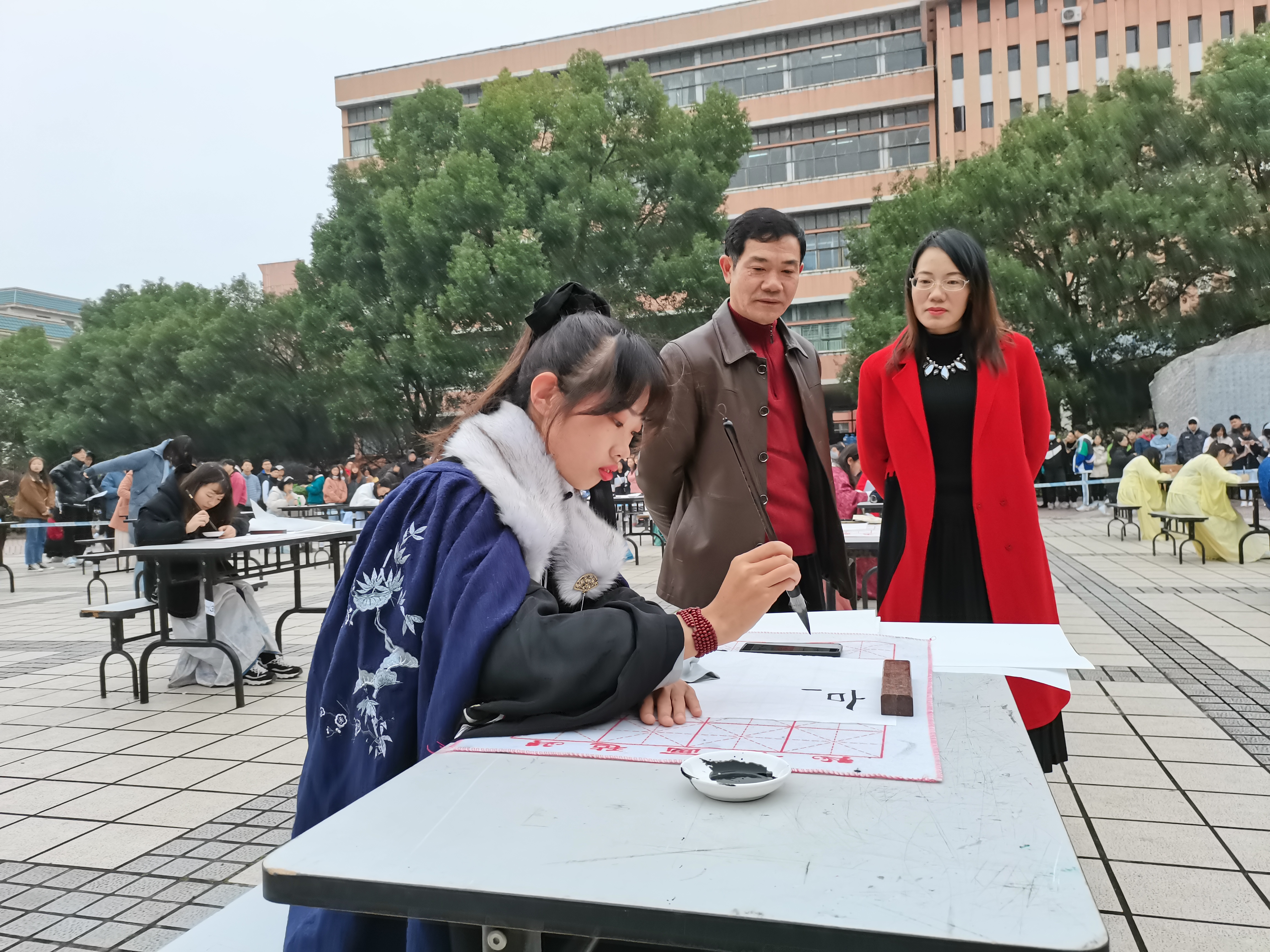 本网讯 为加强“四史”学习教育,11月28日上午,学校在文化广场举办“笔走龙蛇意风发 墨染中华千年史”现场书法大赛,百余名学子身穿汉服,现场挥毫书写历史。副校长吴小林、学校书法研究所所长唐幼铎到场观看指导。