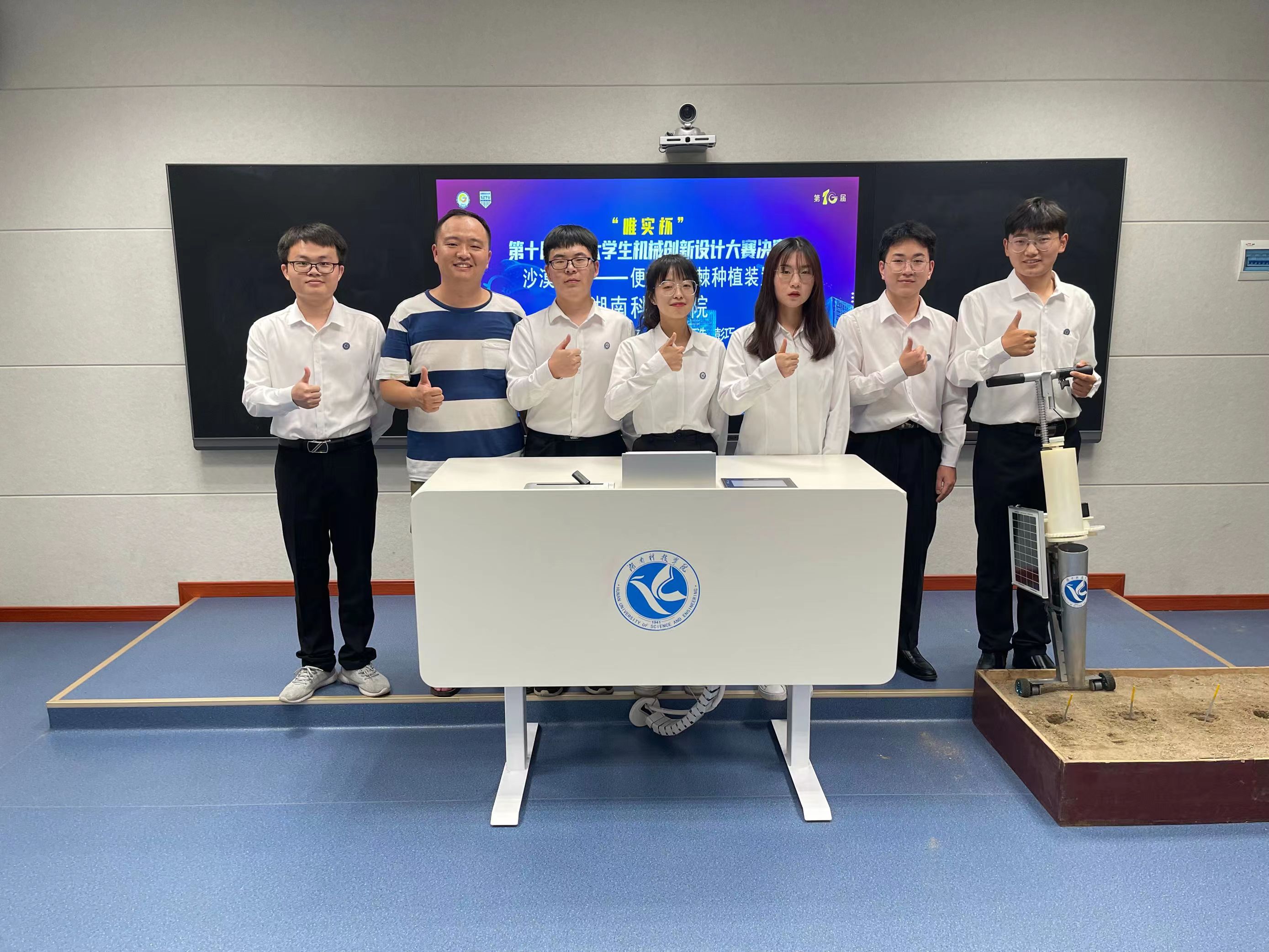 本次比赛,我校学子以生态修复机械为切入点,设计制作了一款集电动挖孔、自动放苗、移动充电于一体的便携式沙棘种植装置。该装置在湖南省省赛评选中与中南大学参赛作品同列湖南省前三入选国赛,获推参加全国总决赛,代表湖南省与全国123所高校同台竞技,展开最后角逐。在总决赛中,经过为期两天的设计资料审阅、作品答辩、实物演示等激烈比拼,我校学子以优异的表现最终摘得桂冠。充分展现了我校良好的教育教学水平和学生较高的科技创新能力,体现了我校大学生科技创新和应用型人才培养质量。