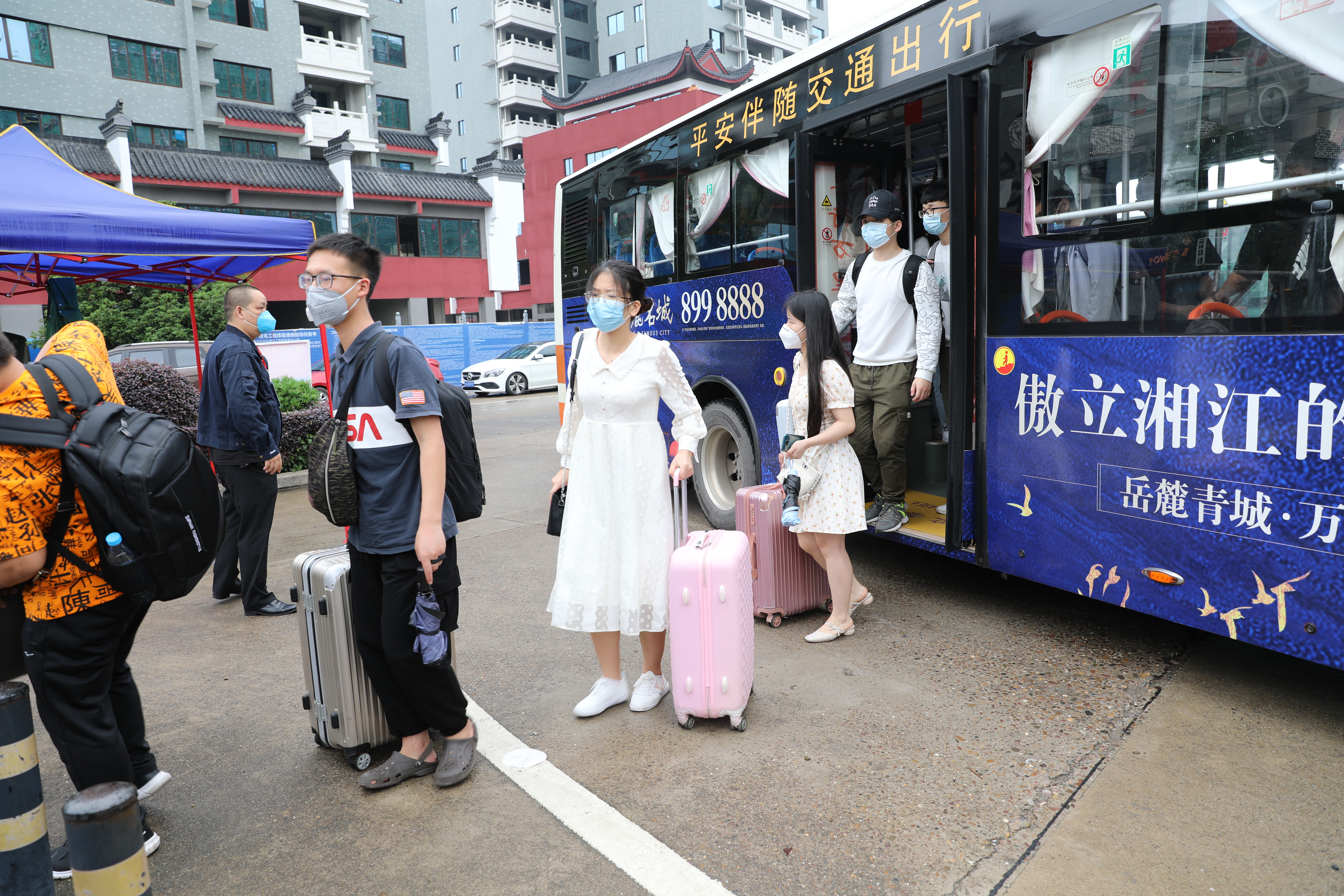本网讯 5月21日,我校首批学生返校复学。在永州火车站、汽车站,学校均设立了接站点,集中统一接送学生直接入校报到。 身份核验、信息登记、测体温、行李消毒、……经一系列检测流程,同学们方可进入校园。 据了解,本次共有近3000名学生返校,均为预科生和毕业年级学生。