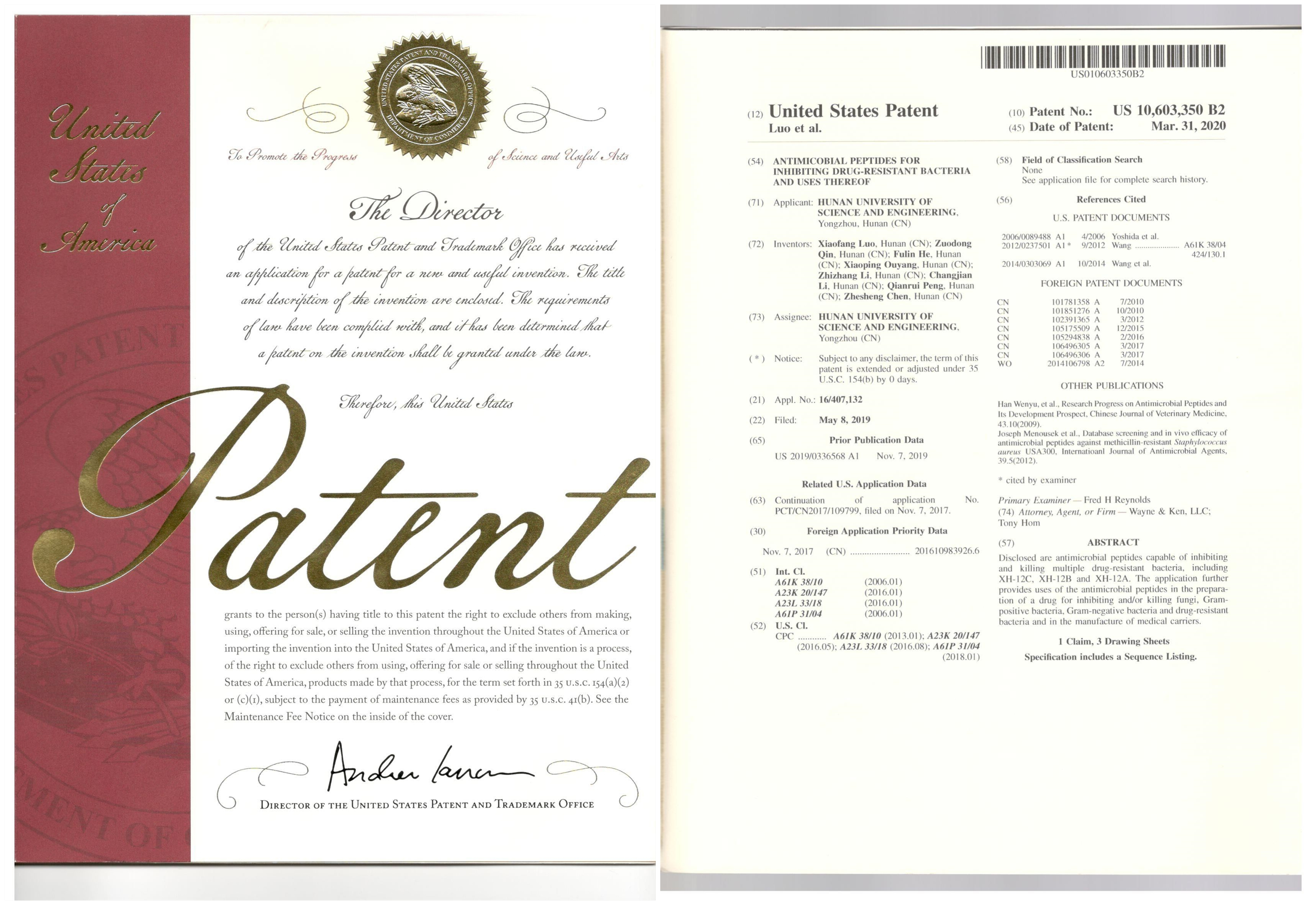 本网讯 近日,由我校覃佐东博士团队领衔的生化工程技术研究中心完成的技术发明成果获得国际授权,《ANTIMICOBIAL PEPTIDES FOR INHIBITING DRUG-RESISTANT BACTERIA AND USES THEREOF》(《抑制耐药细菌的抗菌肽及其用途》)(授权编号:US 10,603,350 B2 ),这是我校生物化工团队完成的技术发明专利成果首次获得国际授权。