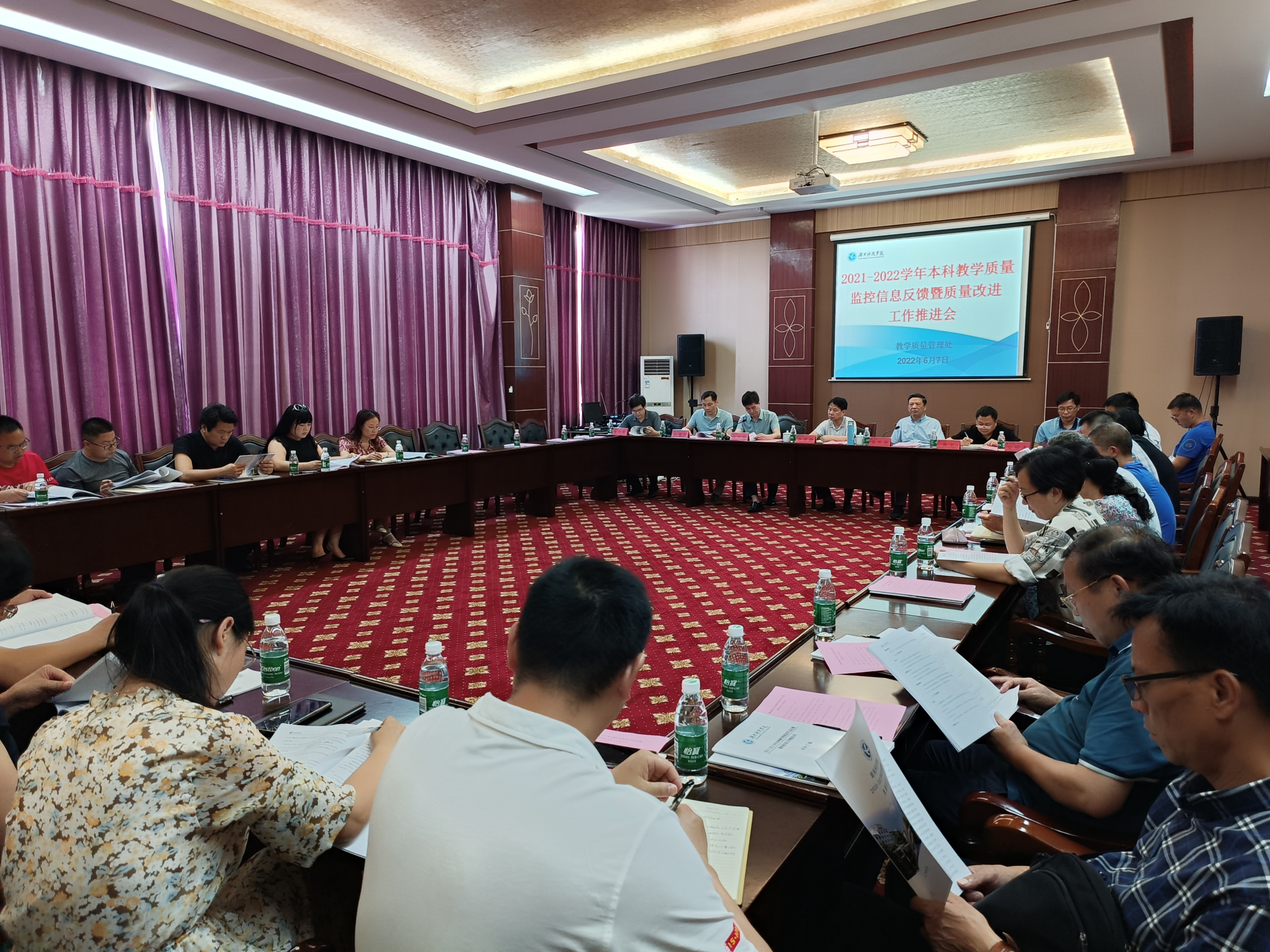 本网讯 6月7日下午,学校召开了2021-2022学年本科教学质量监控信息反馈暨质量改进工作推进会。党委委员、副校长李常健出席会议,校教学督导团团长、各教学学院分管日常教学及实践教学副院长及教务办主任、教务处相关负责人、教学质量管理处全体人员与会。